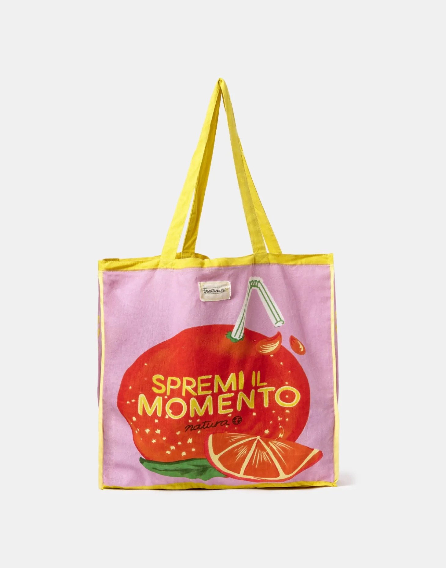 Bolsa de algodón tipo tote bag con doble asa corta y con la imagen de nuestra campaña «Exprime el momento».