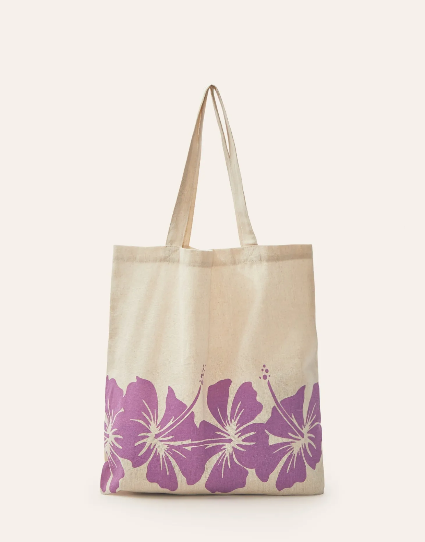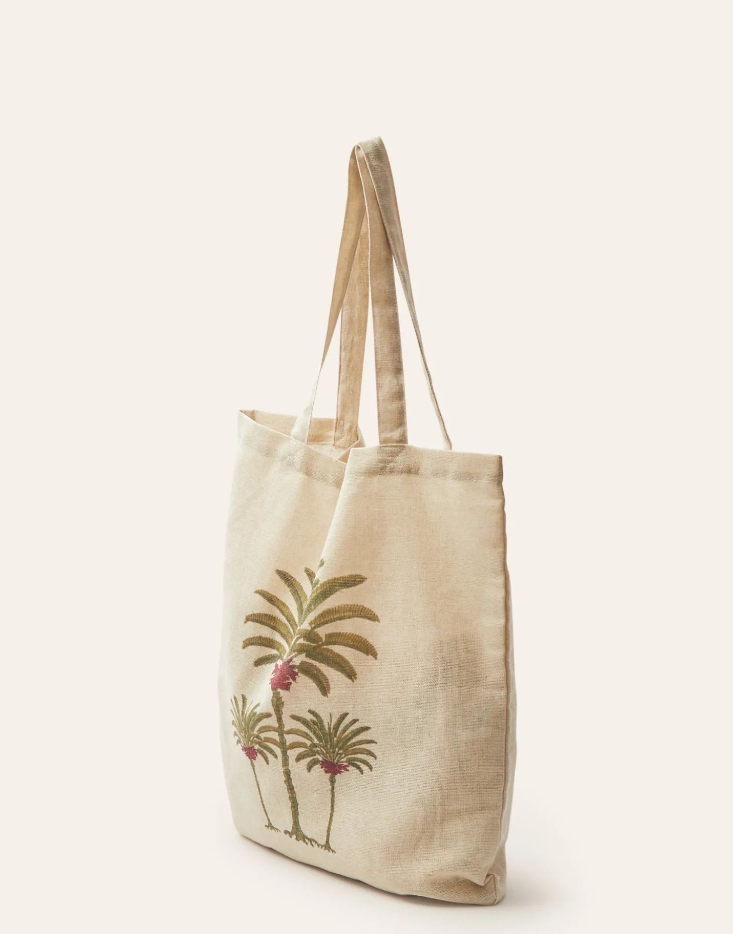 Bolsa de lino tipo tote bag, con dos asas para llevar al hombro y apertura amplia sin cierre. Detalle de palmera en la parte frontal.
