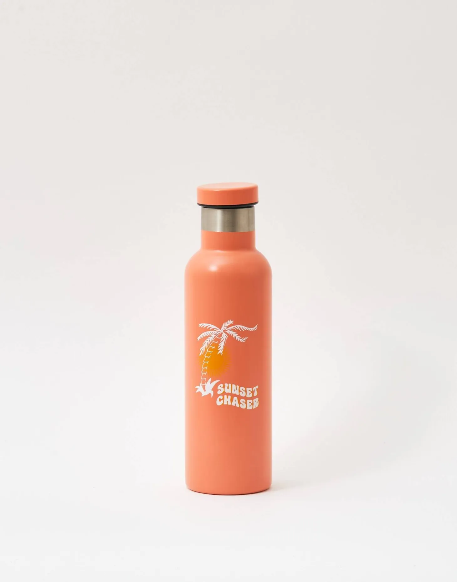 Botella de acero inoxidable con mensaje en la parte frontal.