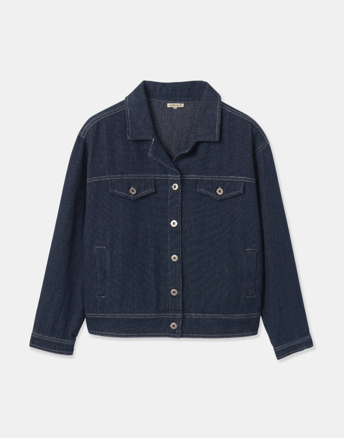 Cazadora denim de cuello solapa y manga larga acabada en puño. Bolsillos de plastrón en pecho y bolsillos laterales. Detalle de costuras a contraste. Cierre frontal con botones metálicos.