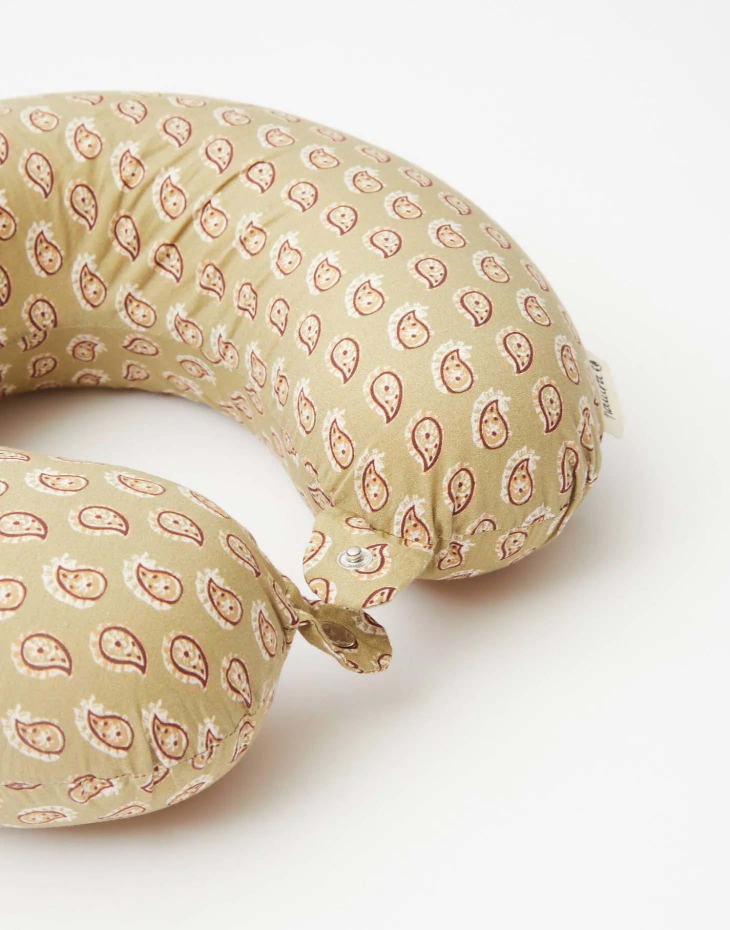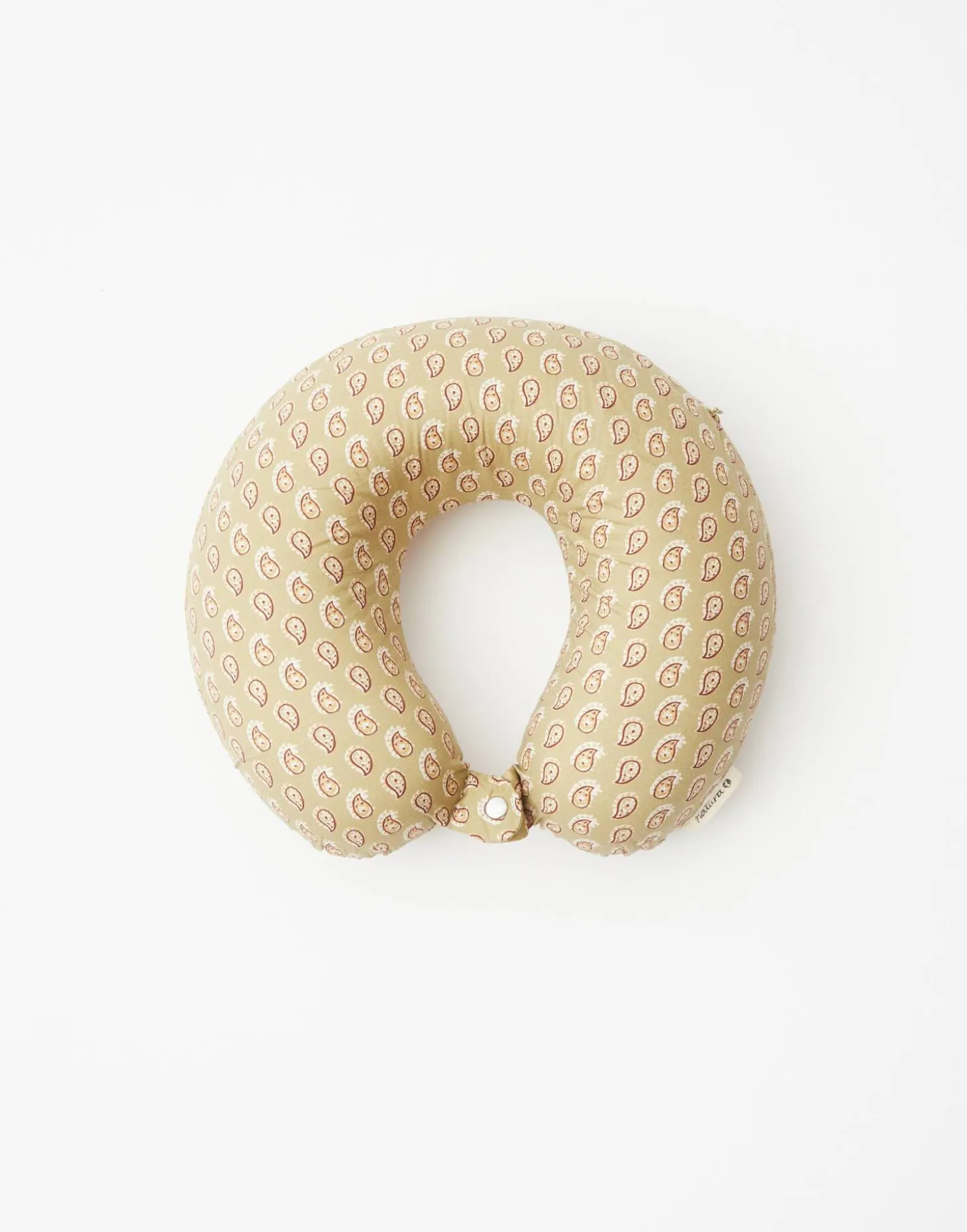 Cojín cervical estampado con cierre de botón. Ideal para llevar de viaje o para quien debe pasar largos periodos en reposo.