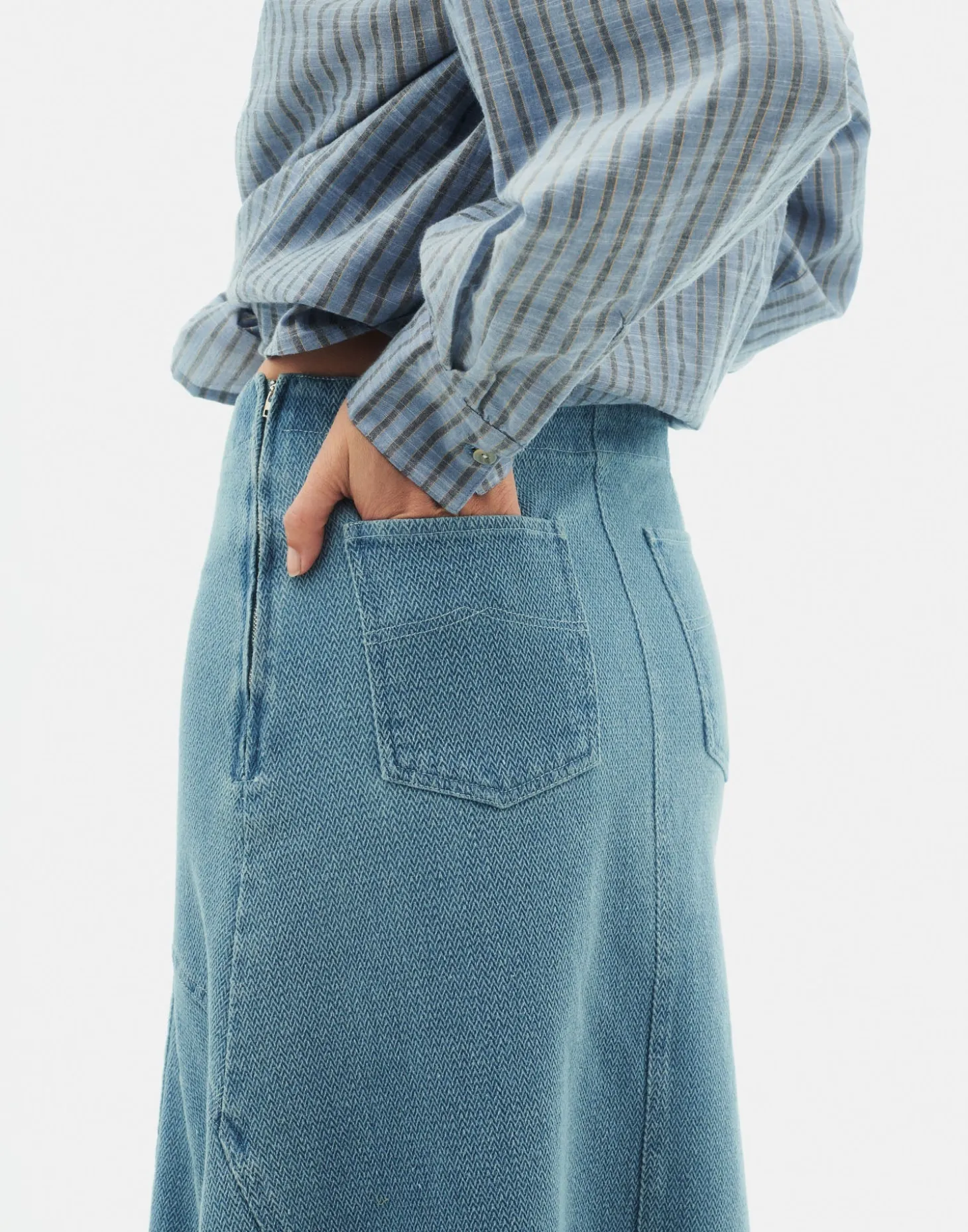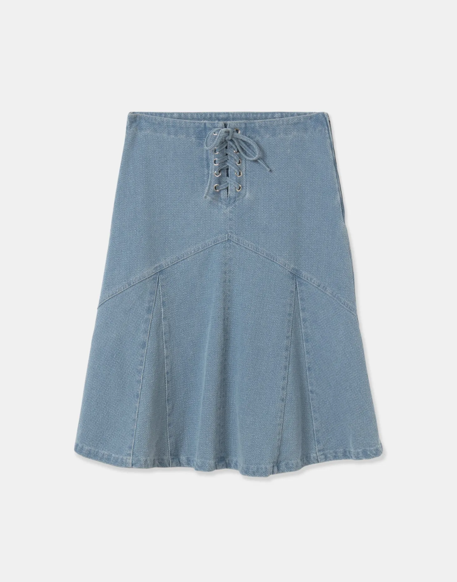 Falda tejana midi con cierre de cordón en la parte frontal y bolsillos de plastrón en la parte trasera. Acabada con volante en el bajo.