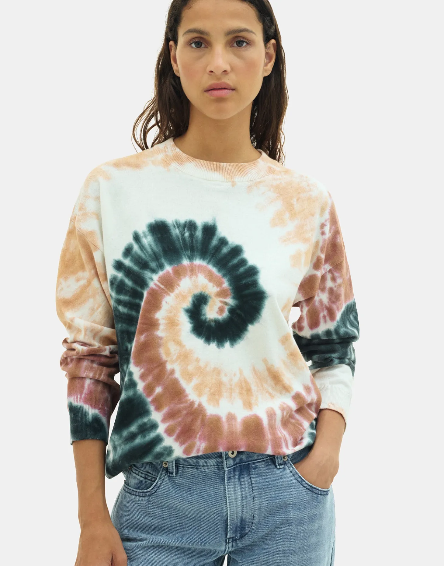Jersey de cuello redondo, con estampado tie dye y acabados en rib.