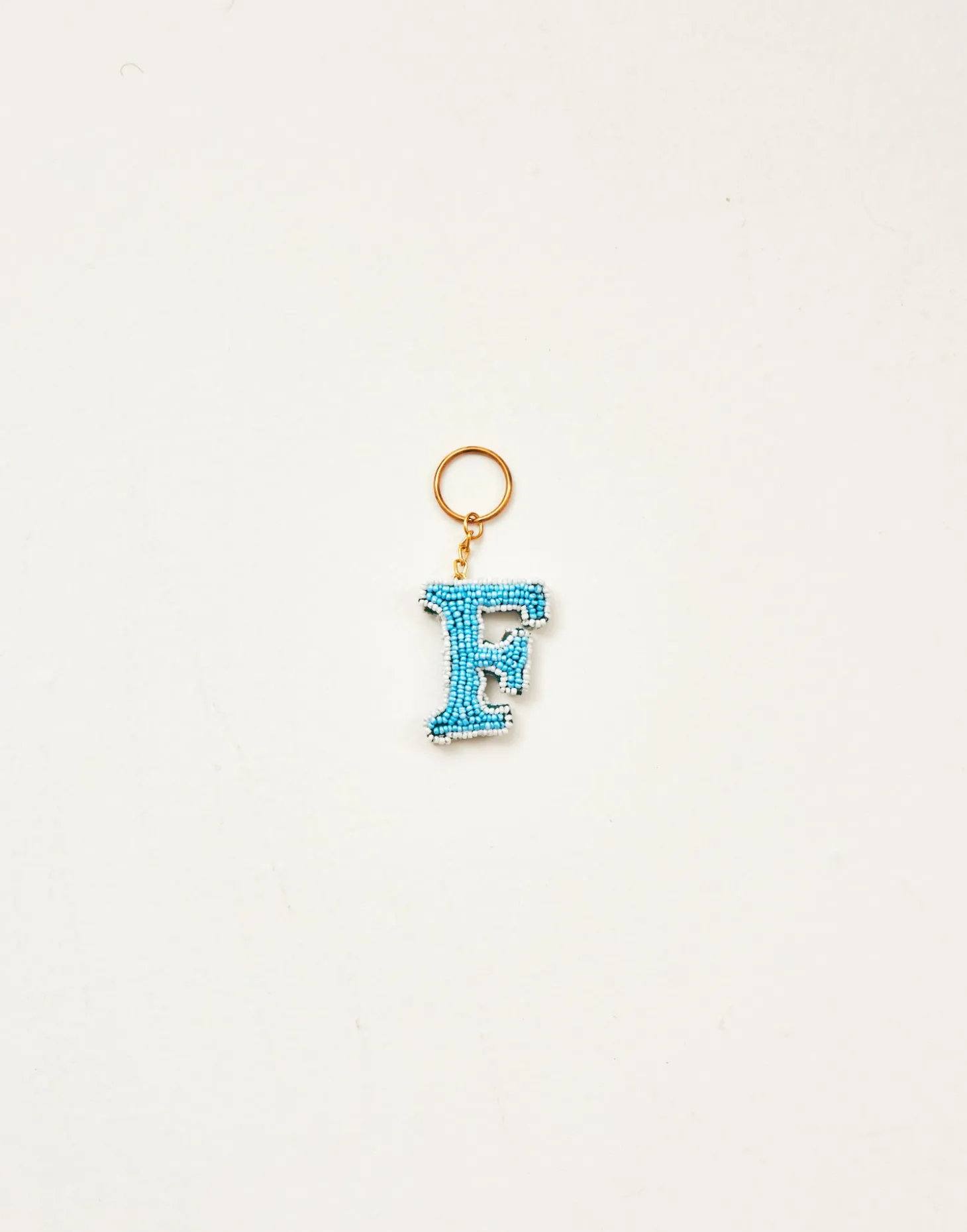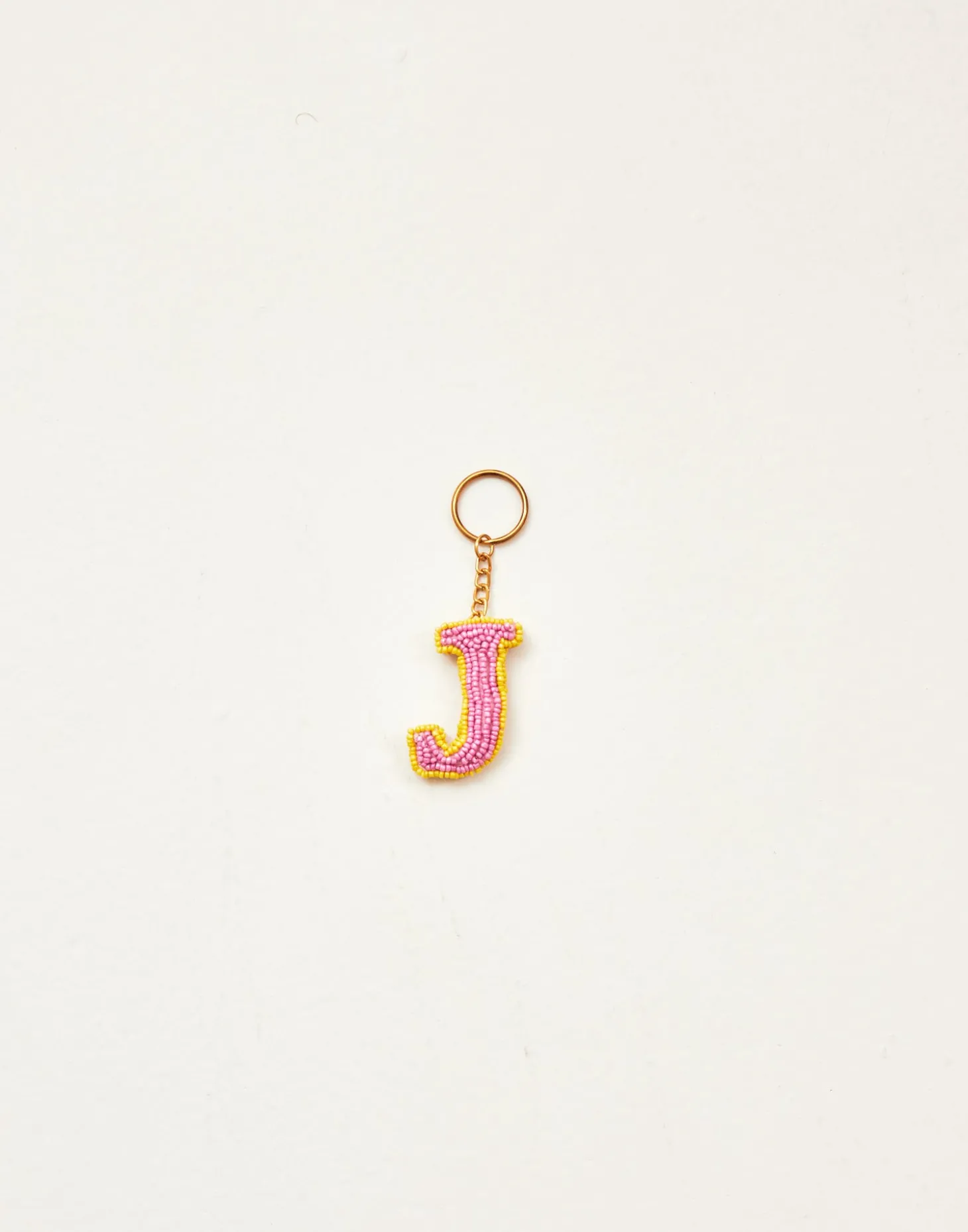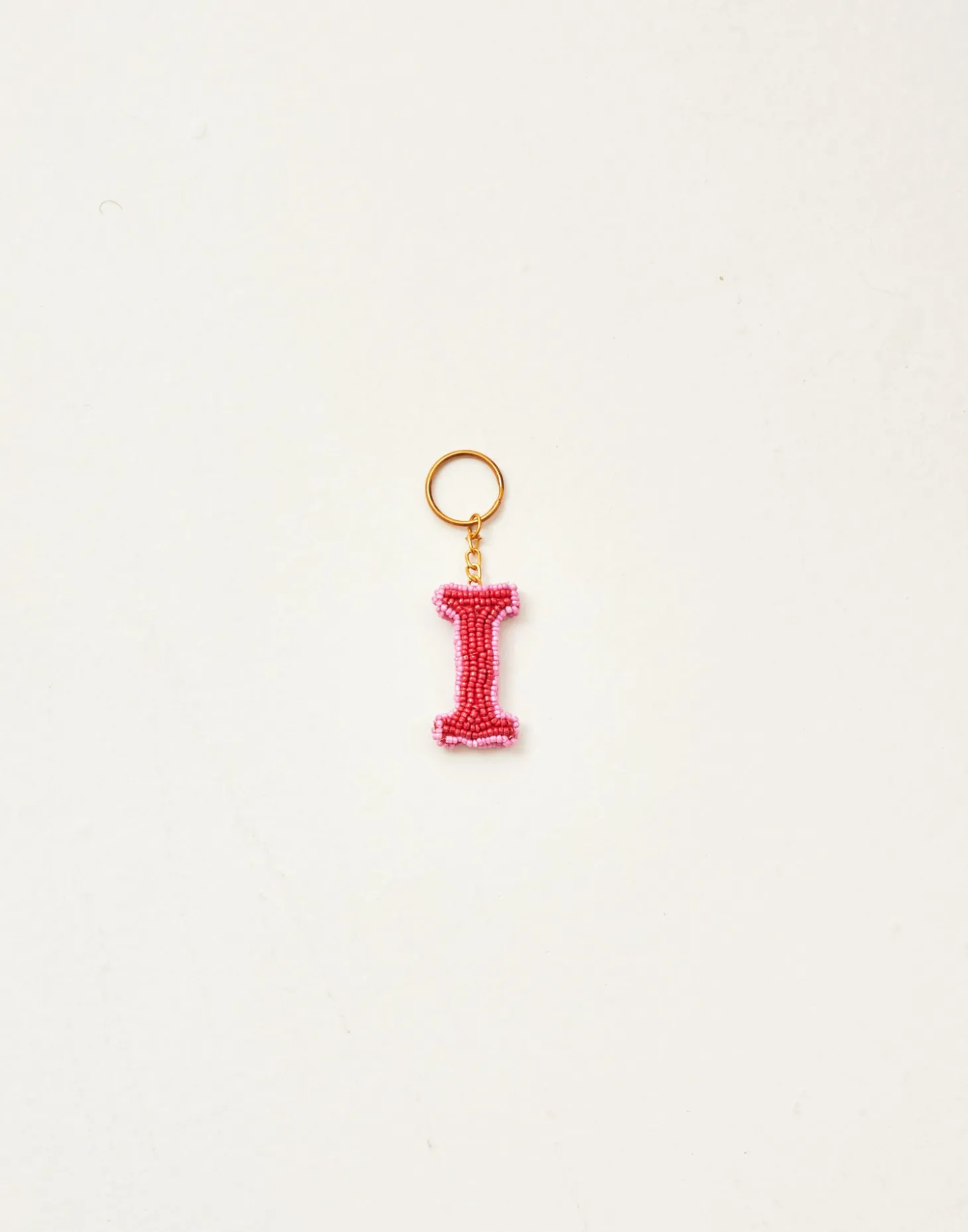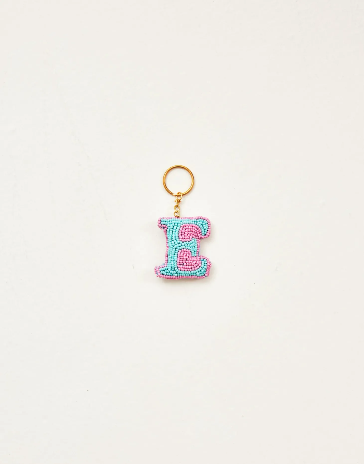 Llavero de letras hechas con cuentas de vidrio acabado con cadena y arandela.