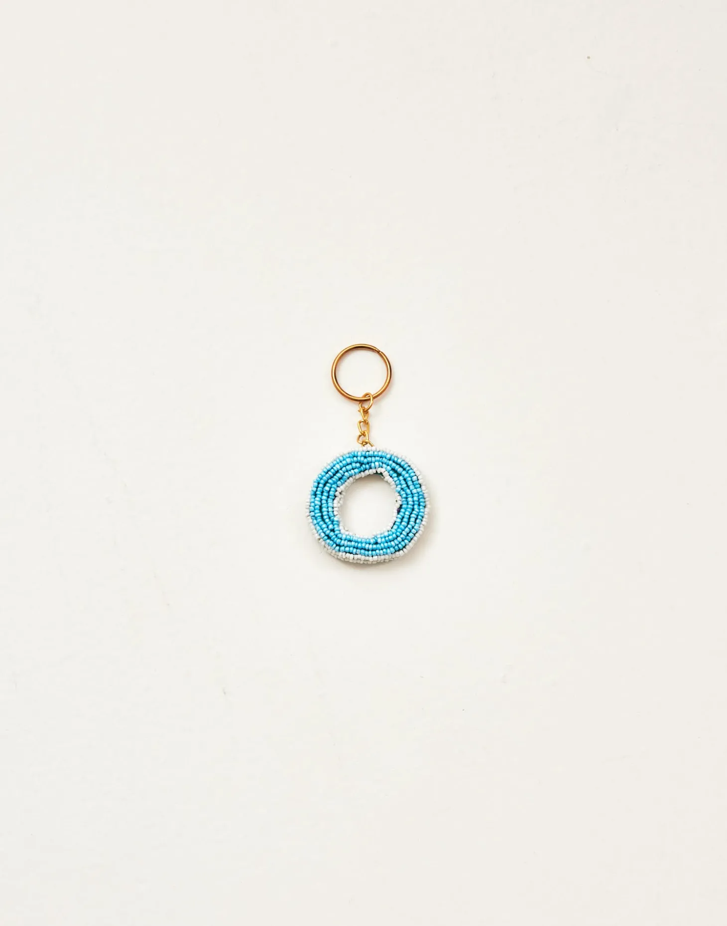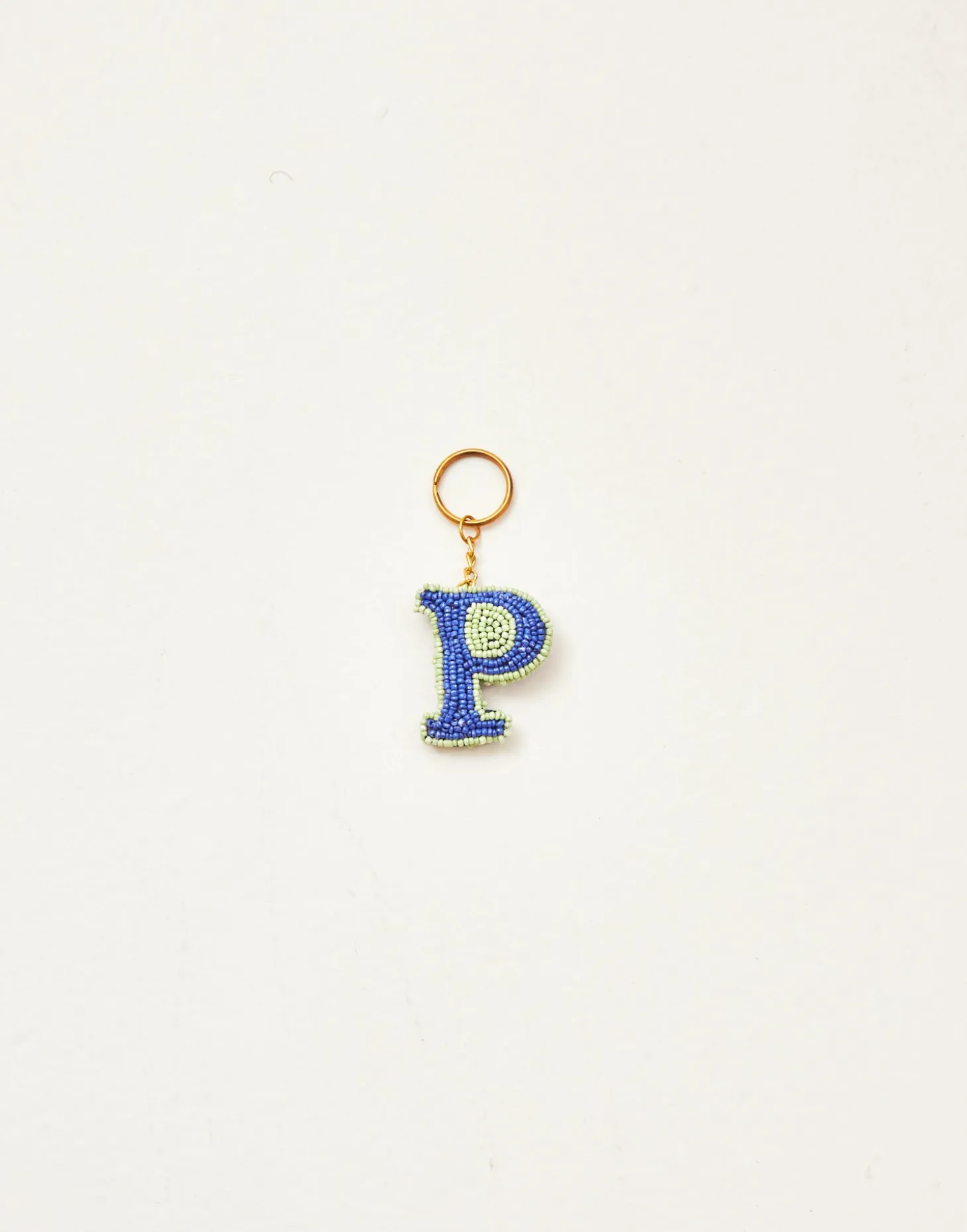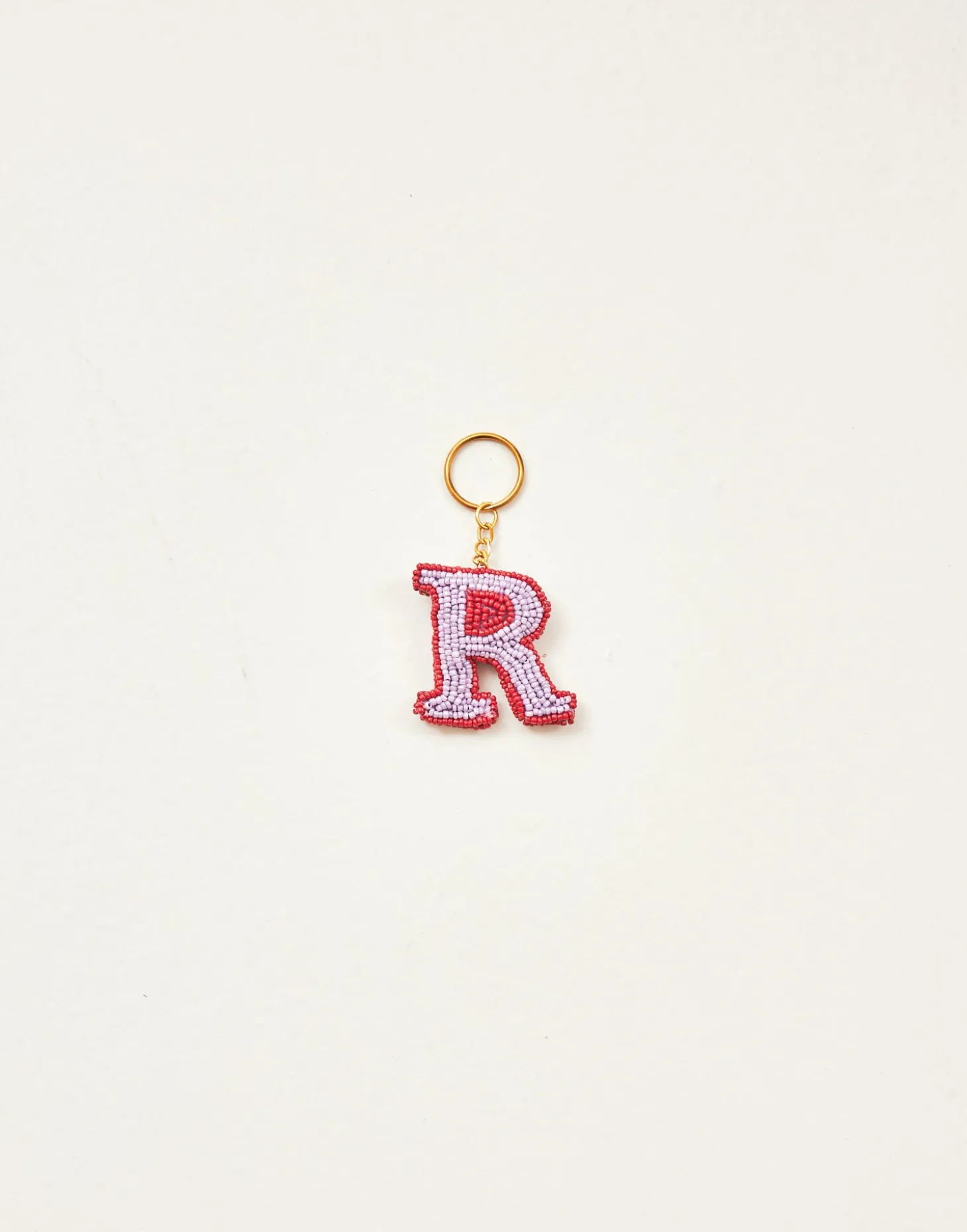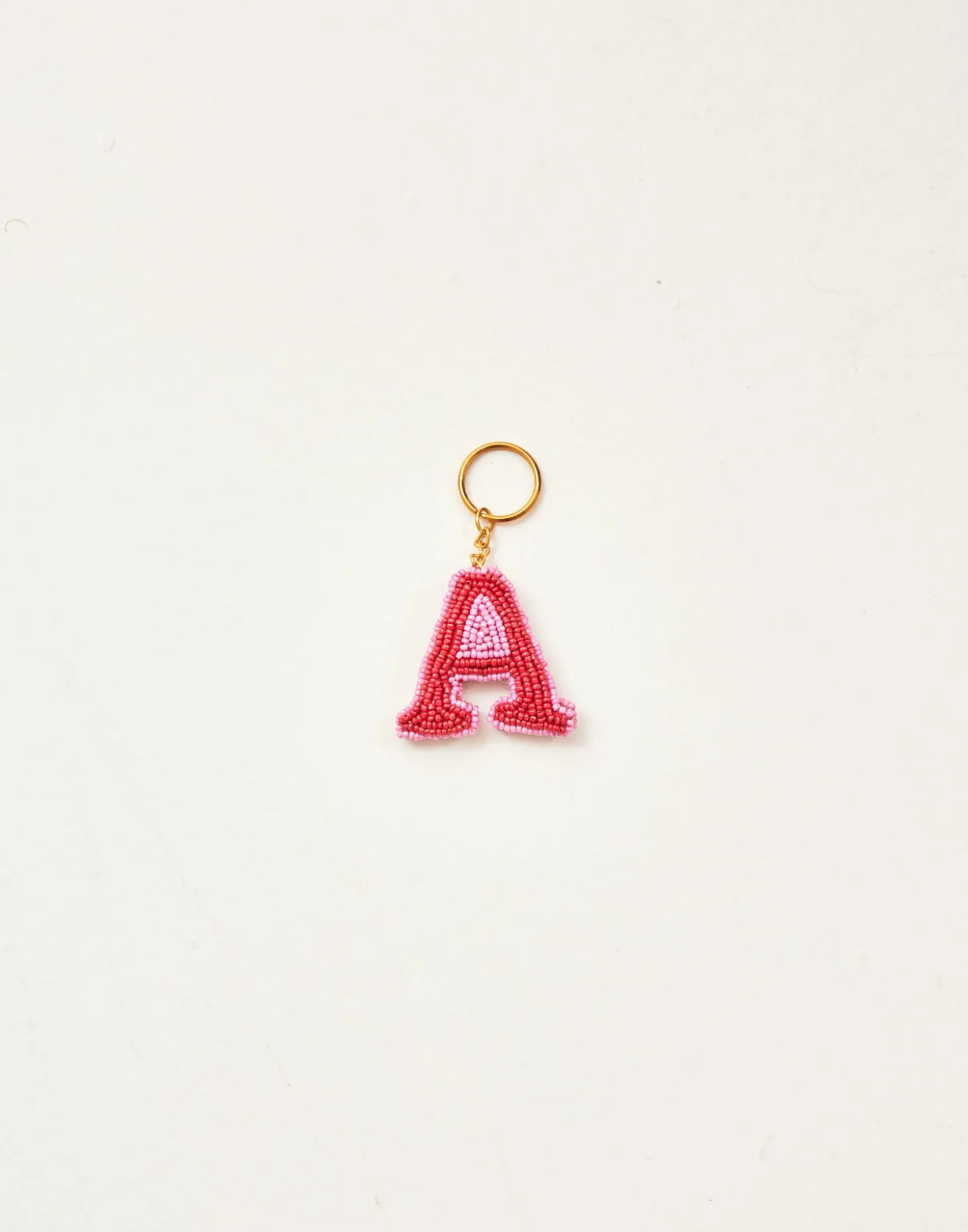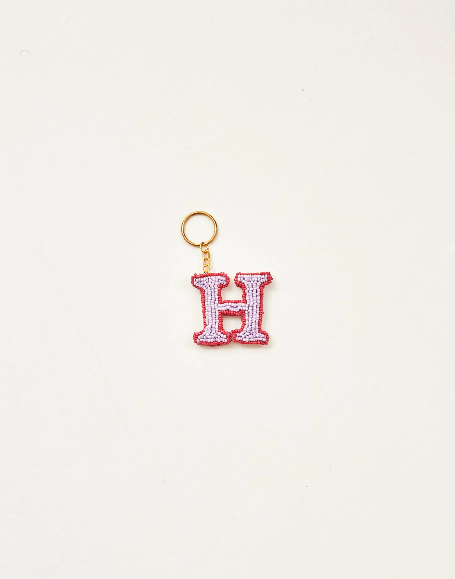 Llavero de letras hechas con cuentas de vidrio acabado con cadena y arandela.