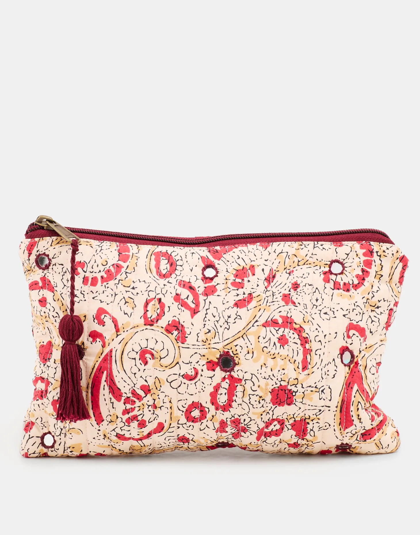 Neceser estampado con detalle de espejos bordados y cierre de cremallera con pompón. Forro interior de tela.