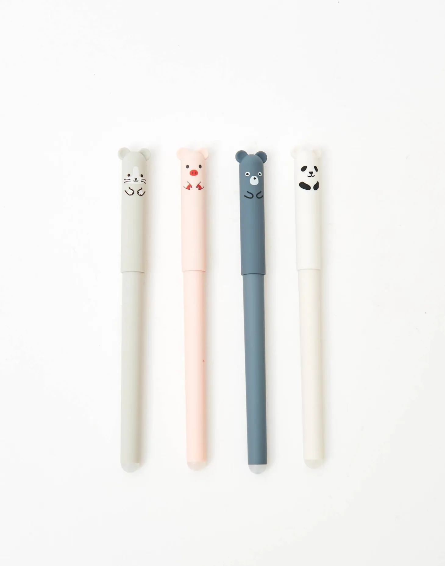 Pack de 4 bolis de tinta negra borrable, con tapa en forma de animalito y goma para borrar.