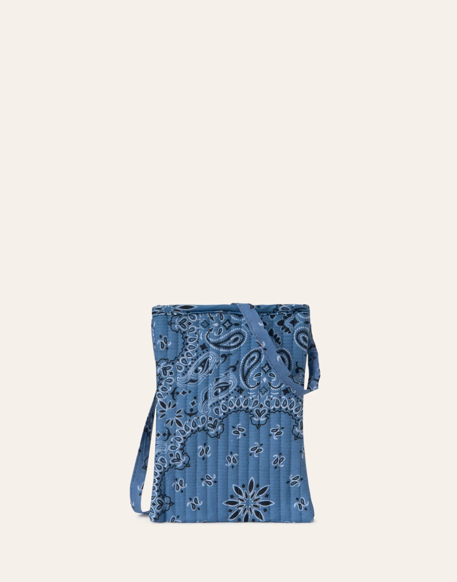Bolsa portamóvil acolchado con estampado de bandana y cierre de cremallera. Acabado con cinta larga para poder llevarlo cruzado al hombro.