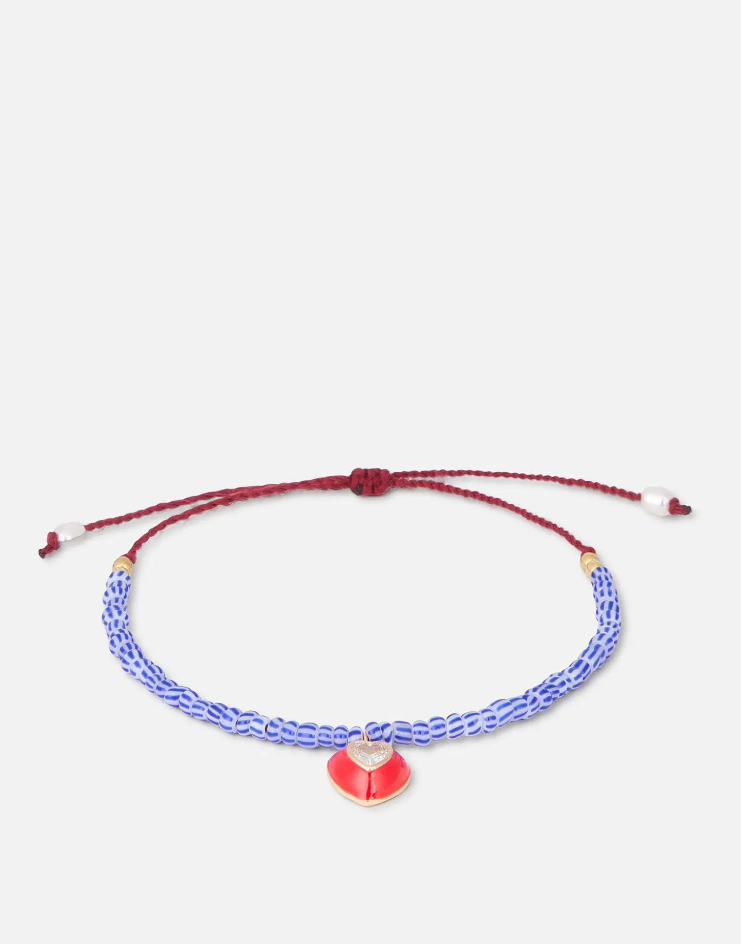Pulsera de hilo con cuentas y detalle de corazón con circonia. Cierre de nudo corredizo.