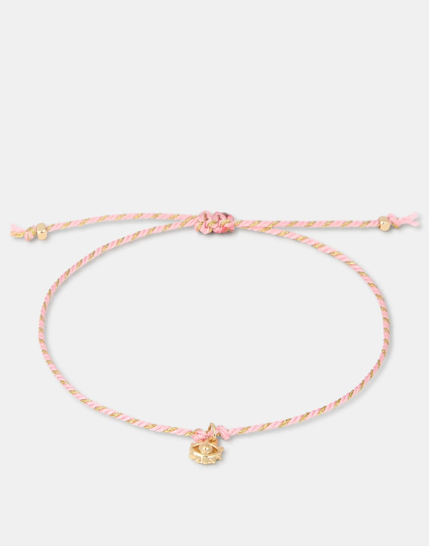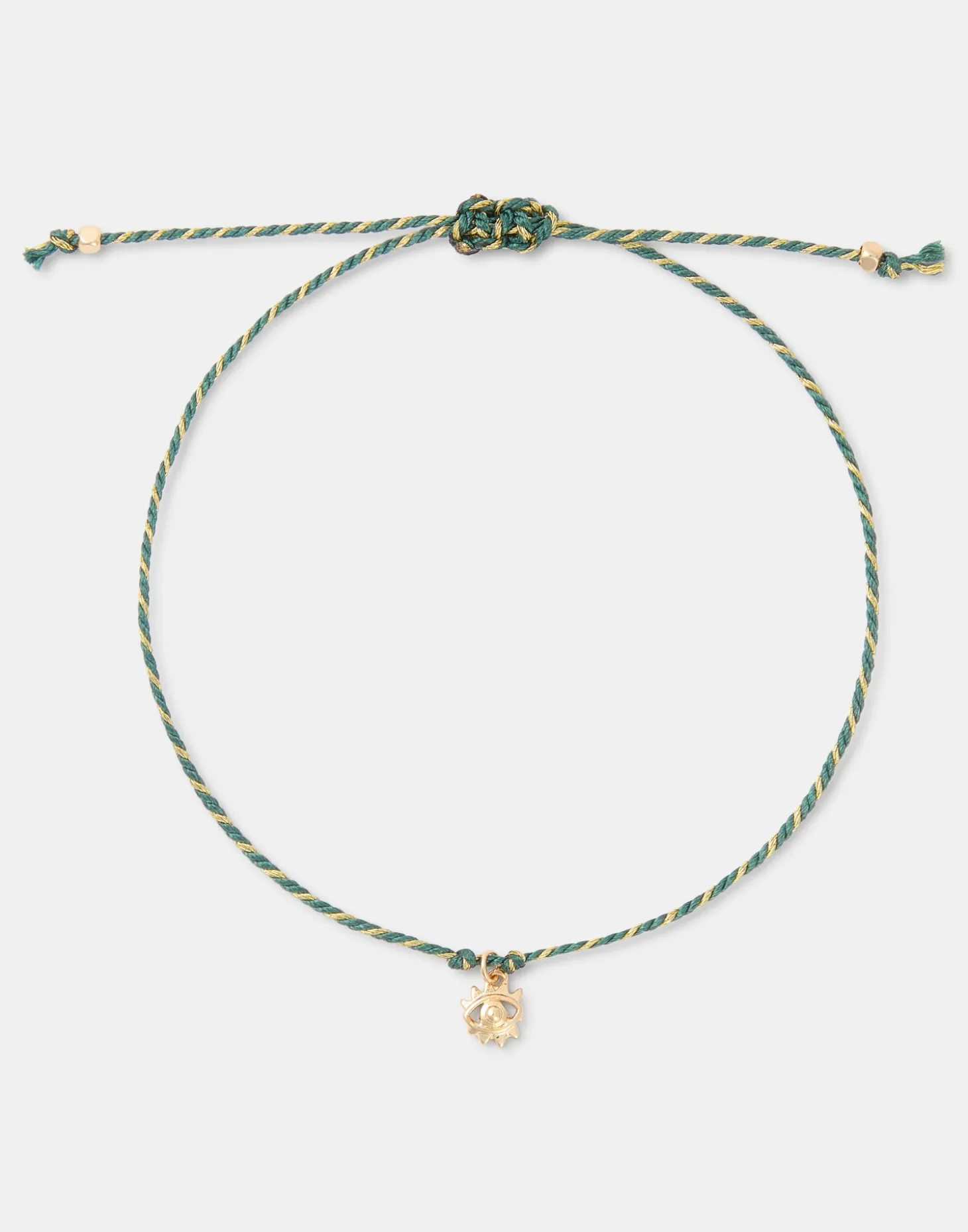 Pulsera de hilo con abalorio dorado y cierre de nudo corredizo.