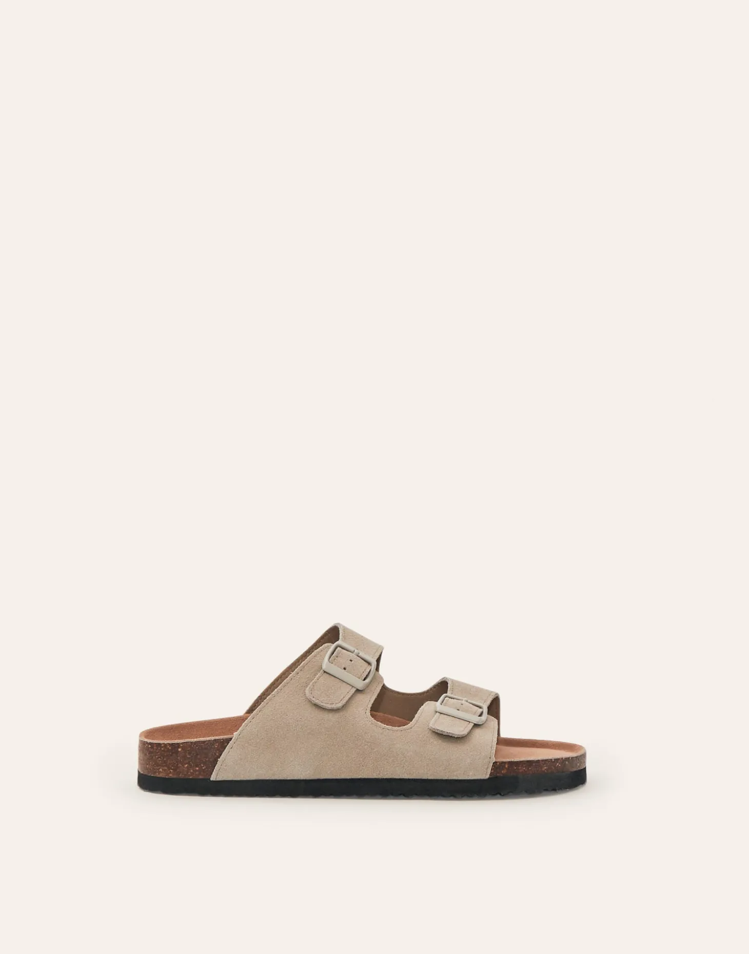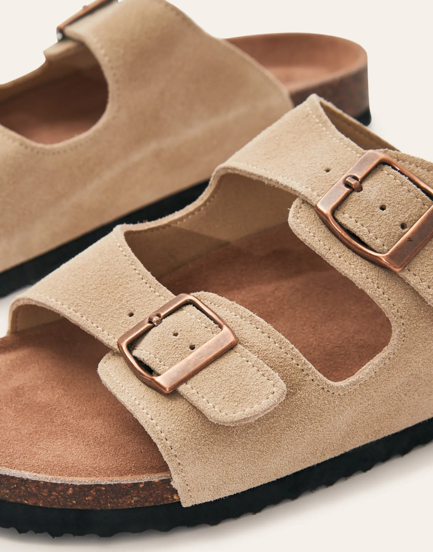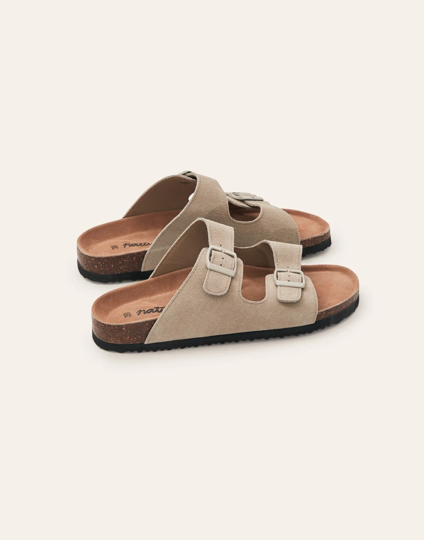 Sandalia ergonómica de piel. Ancho ajustable mediante doble tira con hebillas.
