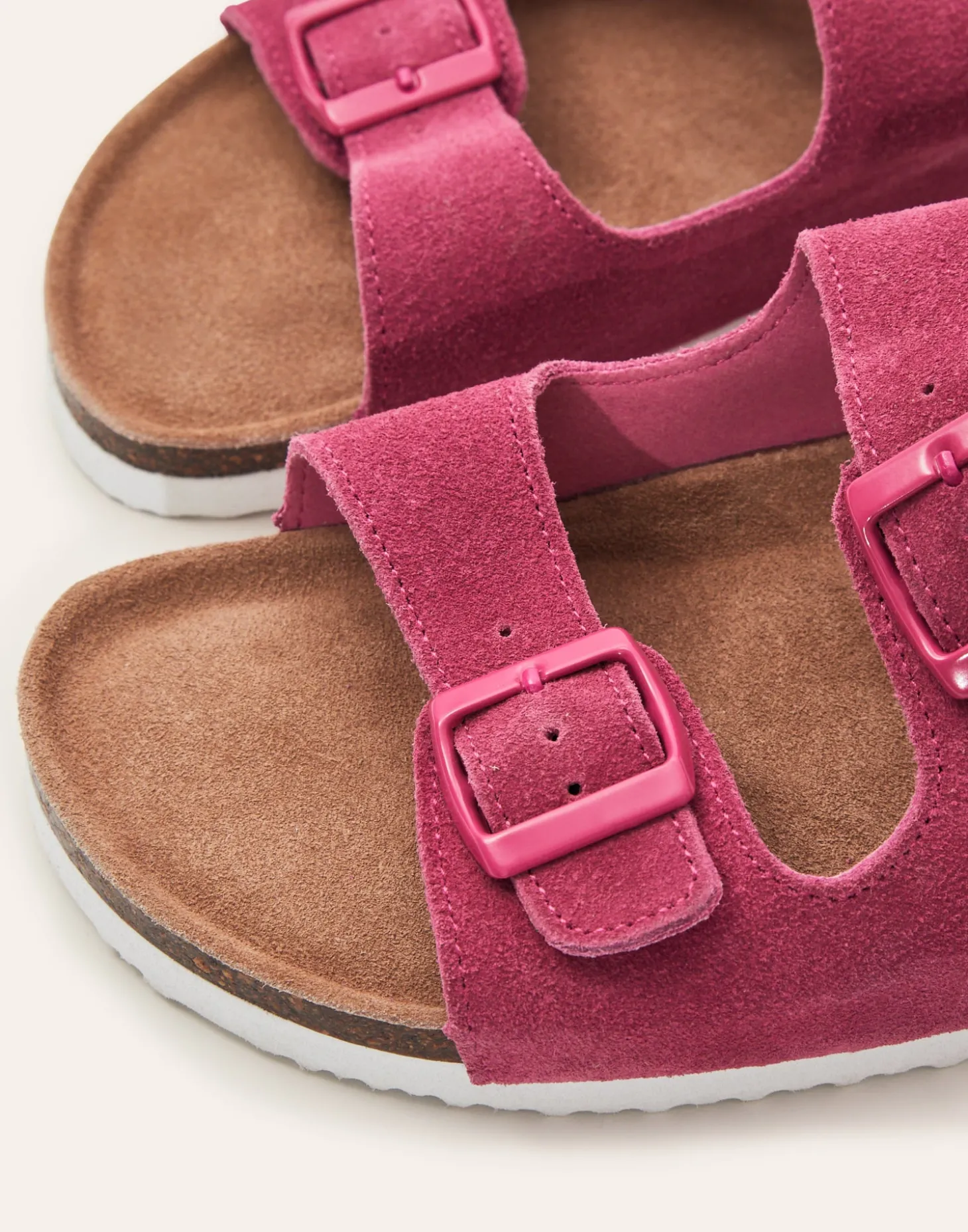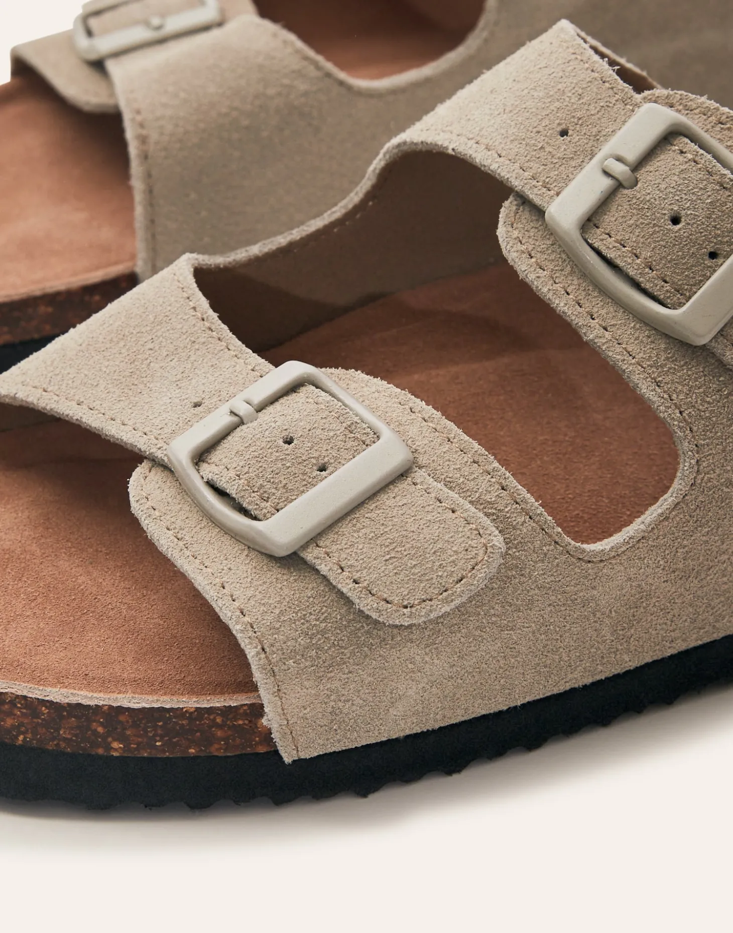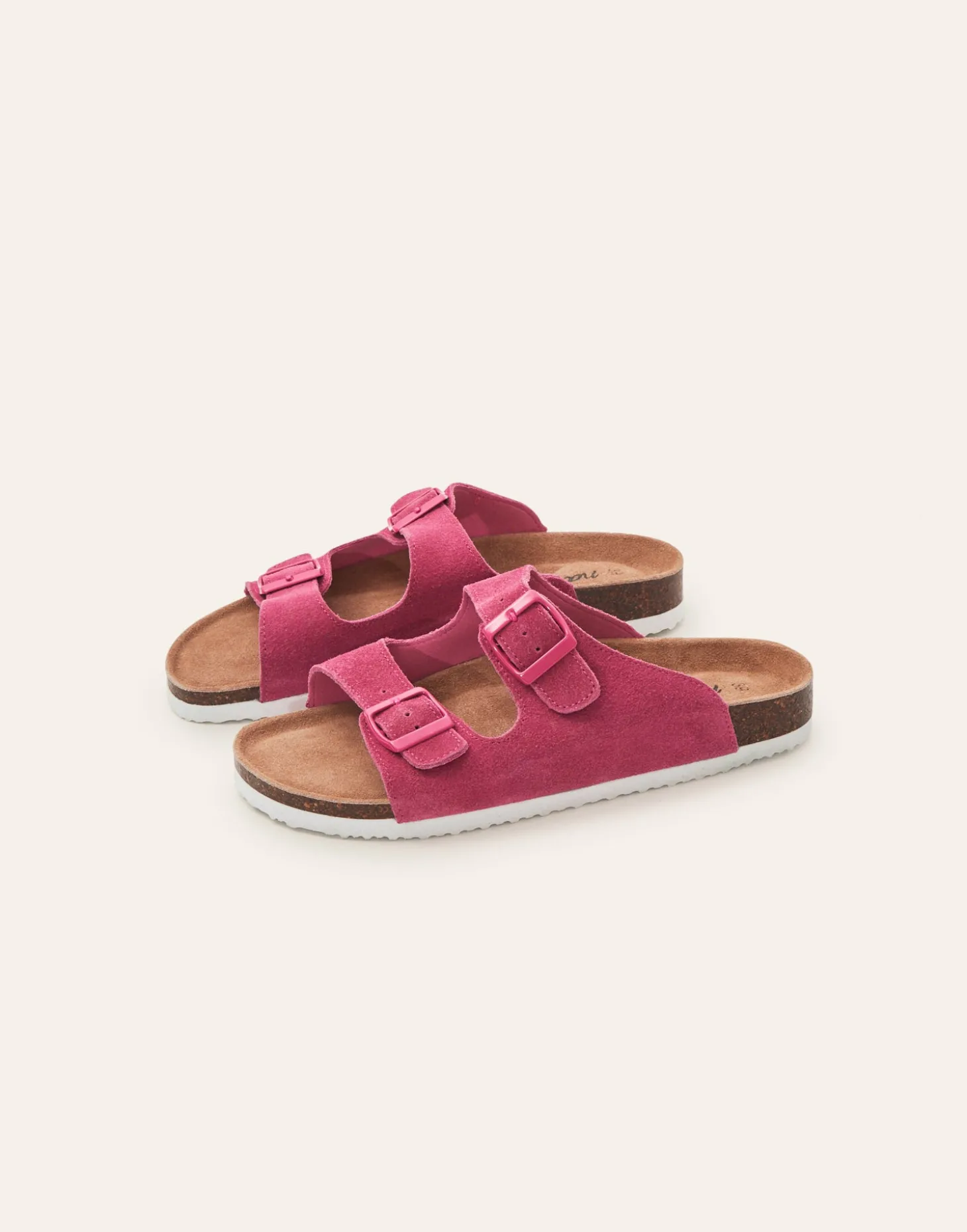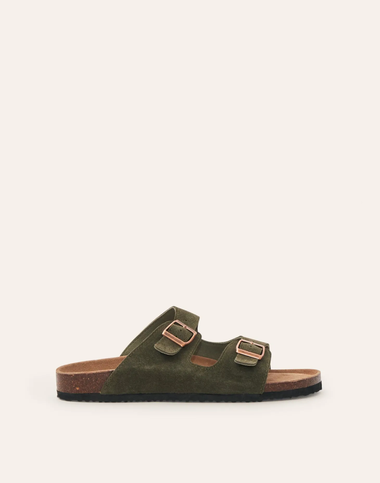 Sandalia ergonómica de piel. Ancho ajustable mediante doble tira con hebillas.