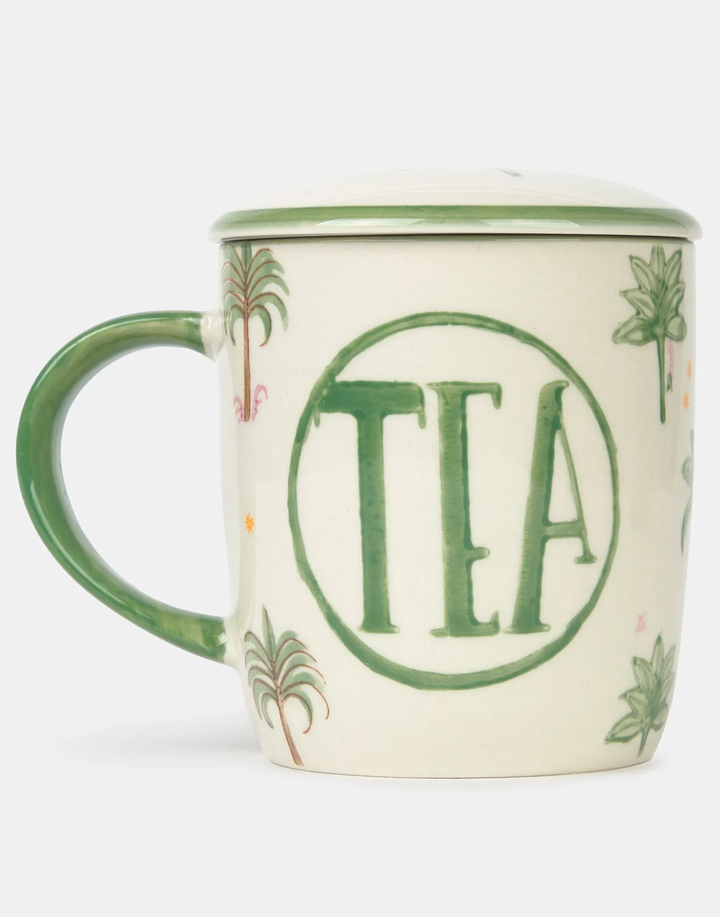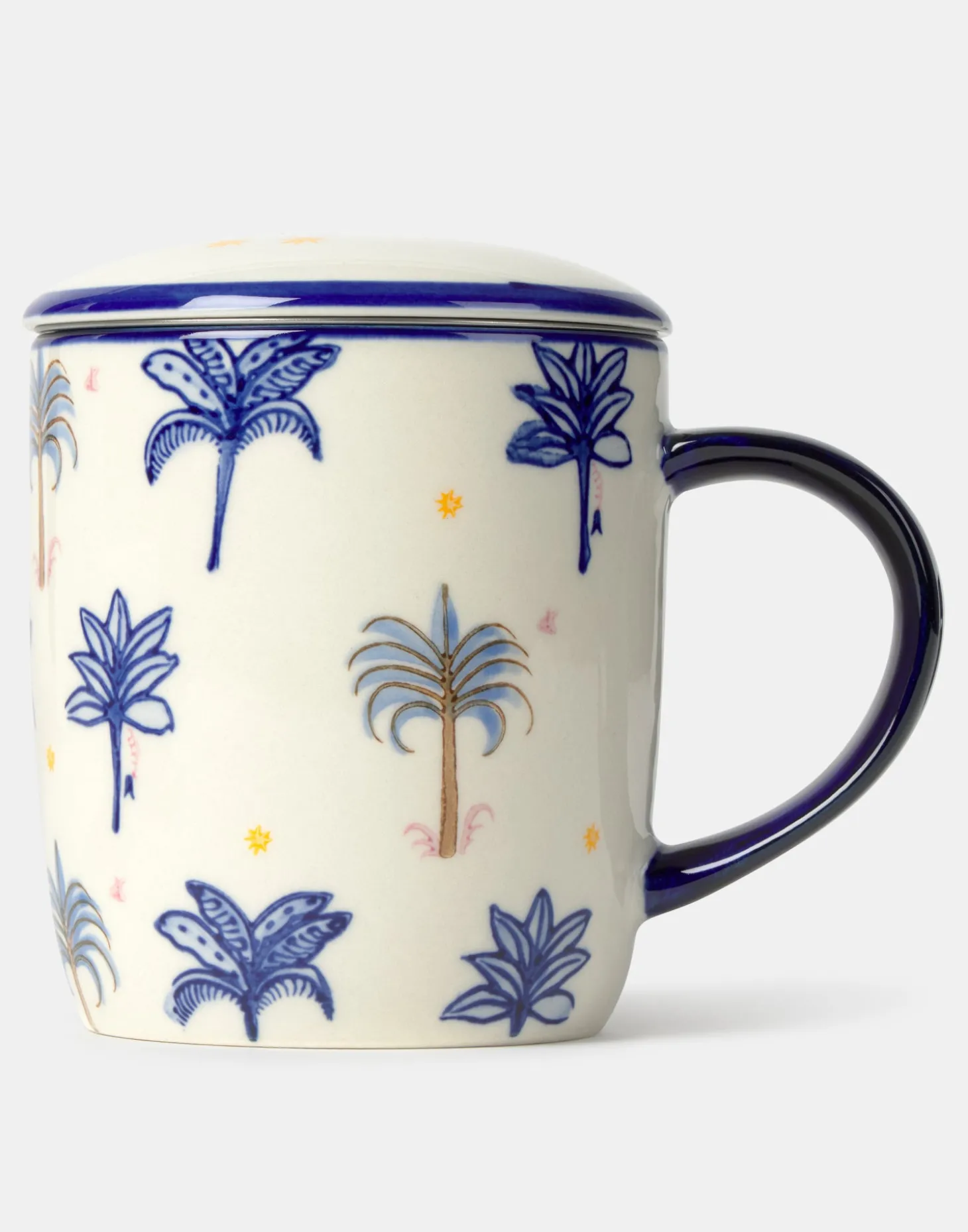 Taza cerámica con estampado de palmeras, tapa y filtro para tus tés e infusiones.