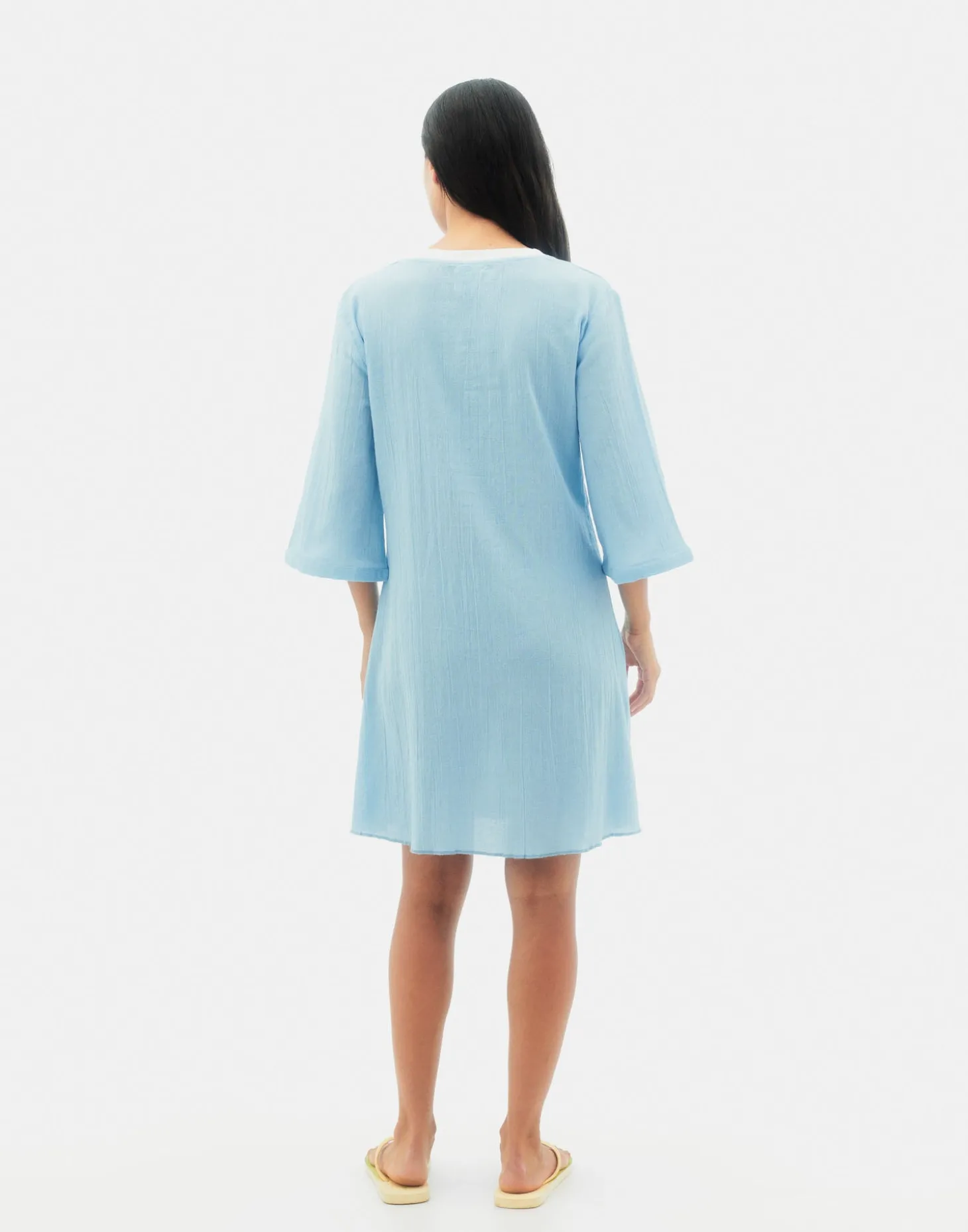 Vestido corto de algodón, con escote de pico y manga tres cuartos.