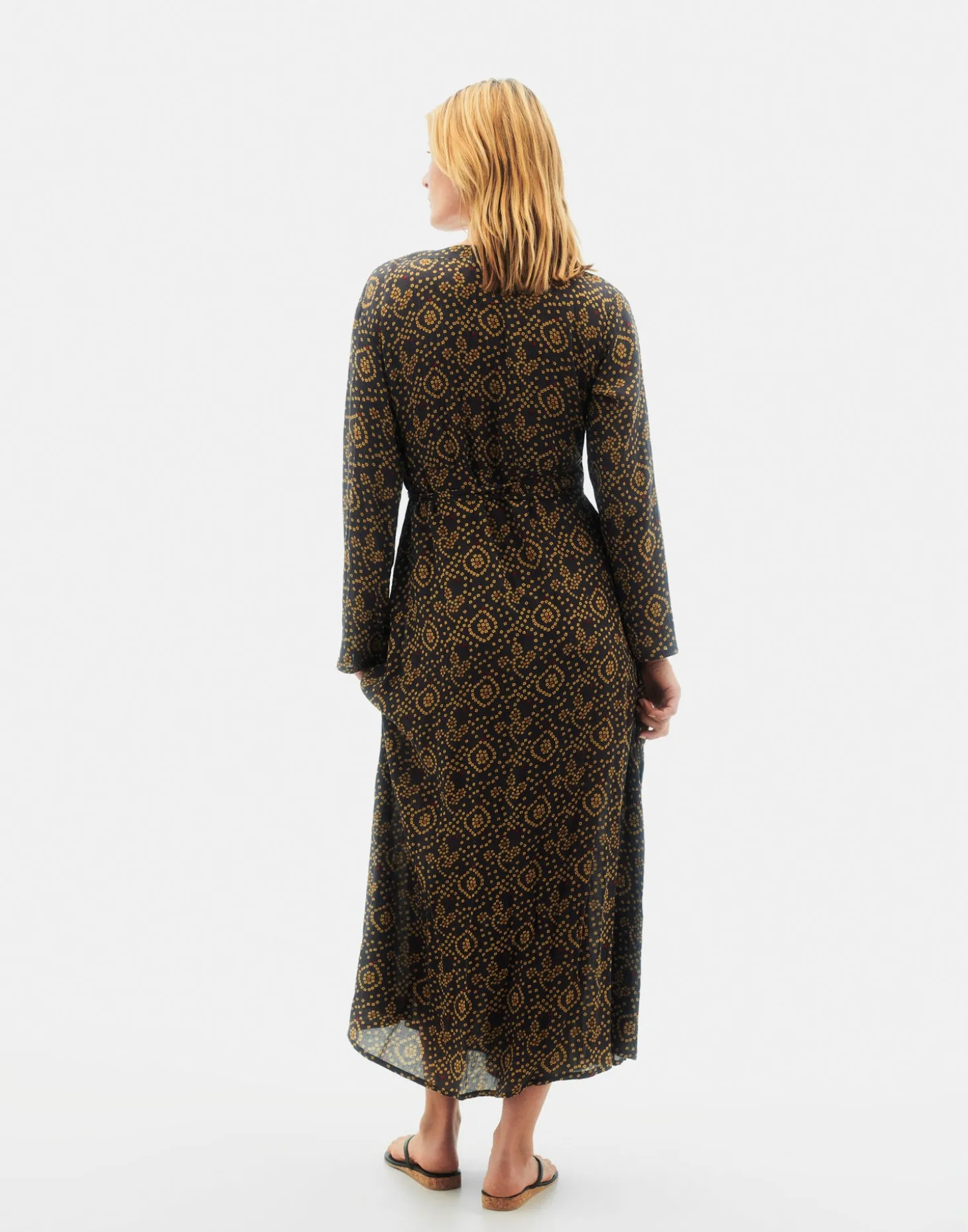 Vestido con estampado estilo bandani. De manga larga, escote de pico y cierre de cinturón a tono.