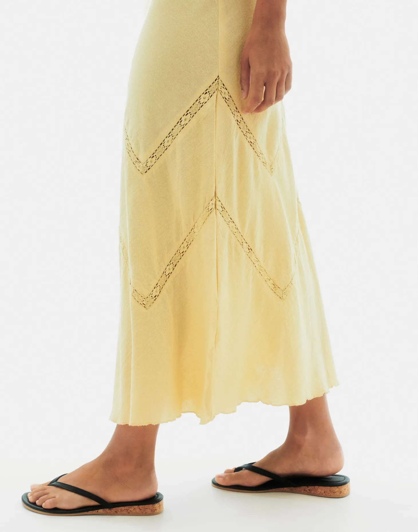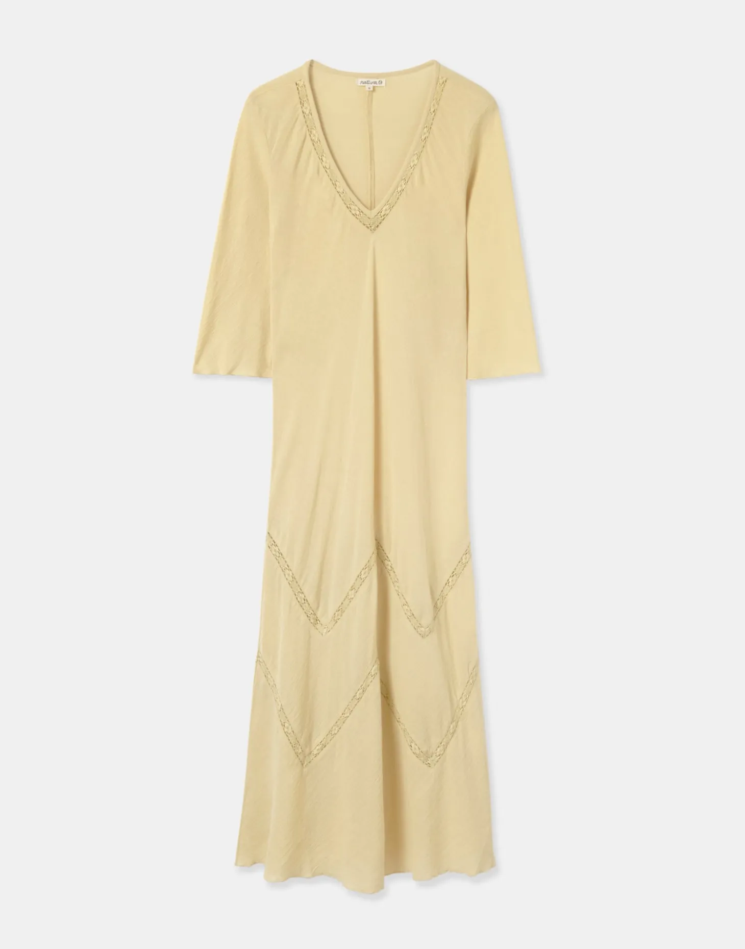 Vestido largo de algodón con manga 3/4, escote de pico y detalles de encaje.