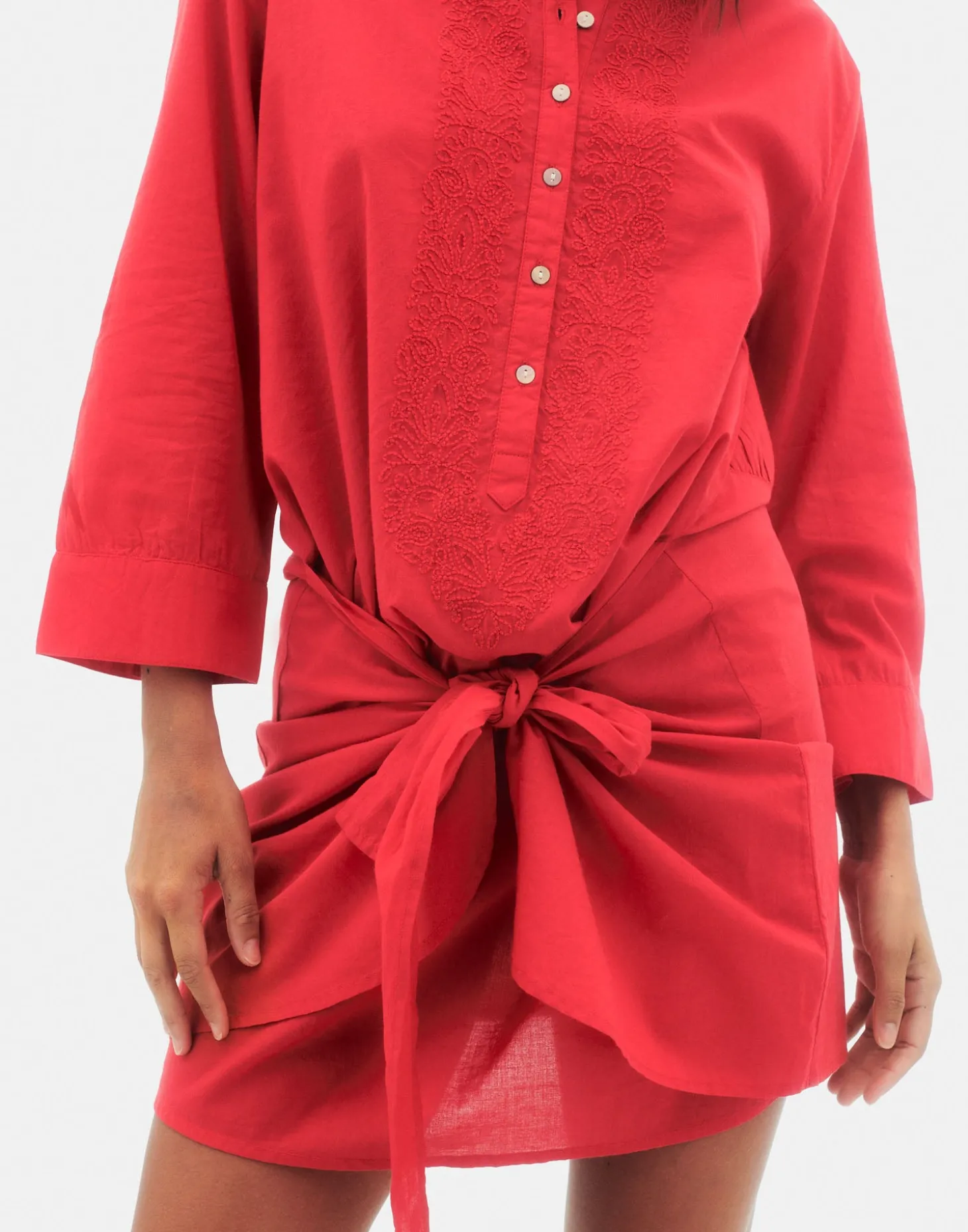 Vestido corto tipo kurta con detalles bordados, manga larga con puño abotonado y cuello redondo. Acabado con cierre de lazo en la parte frontal.