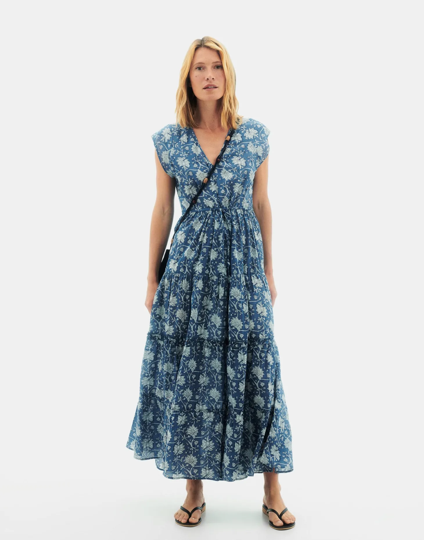 Vestido largo fluido con escote de pico y manga sisa. Detalle de volantes, estampado floral y cintura ajustable mediante lazo.