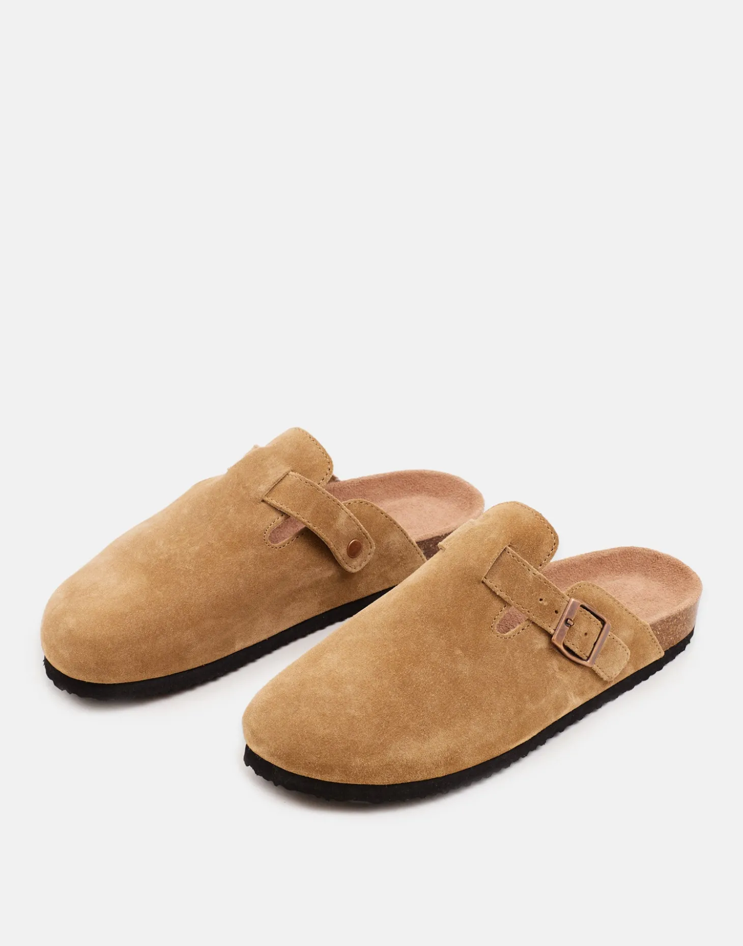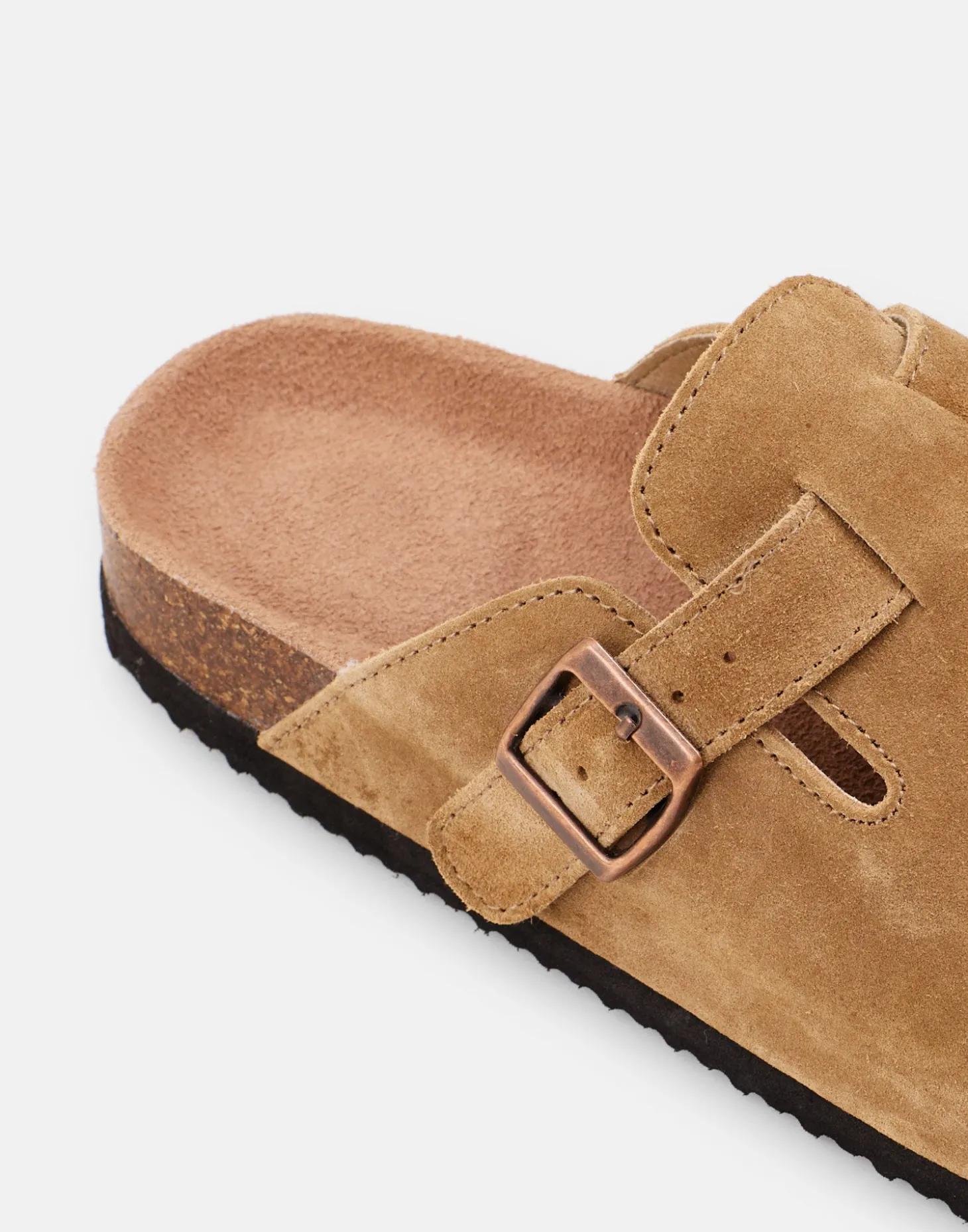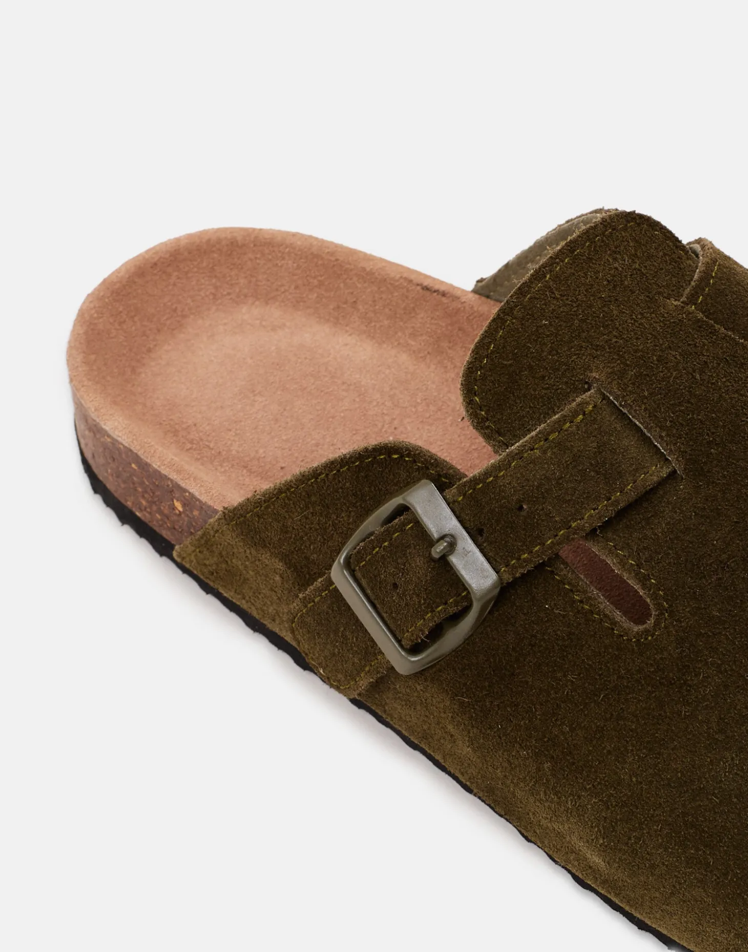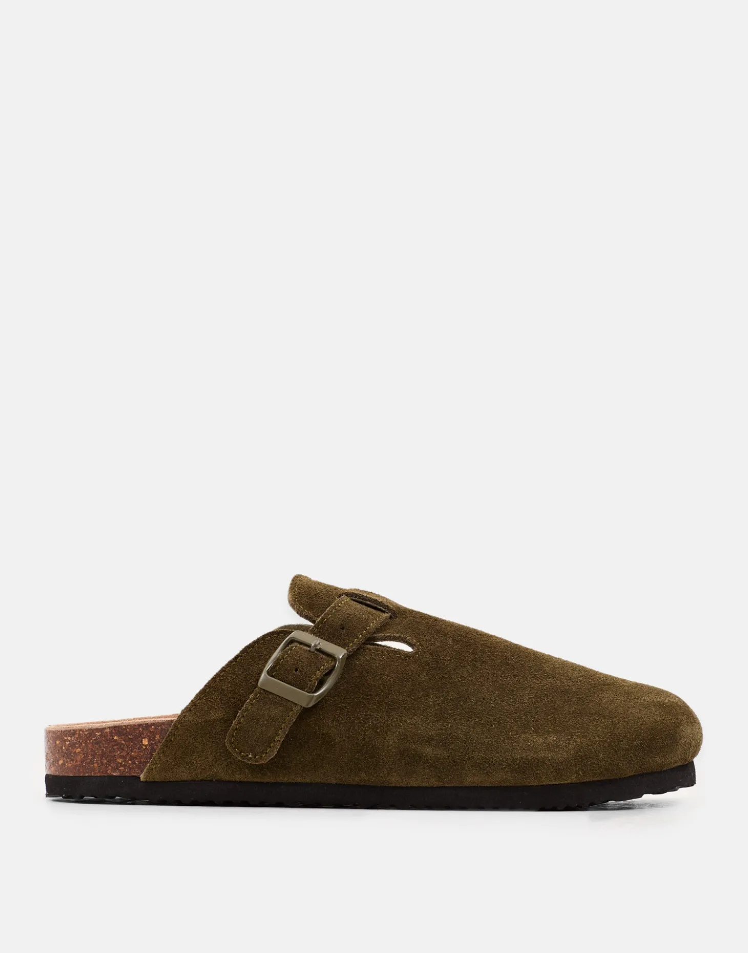 Zapato tipo zueco con diseño destalonado, corte de piel de serraje y suela de corcho. Detalle de hebilla en el corte.