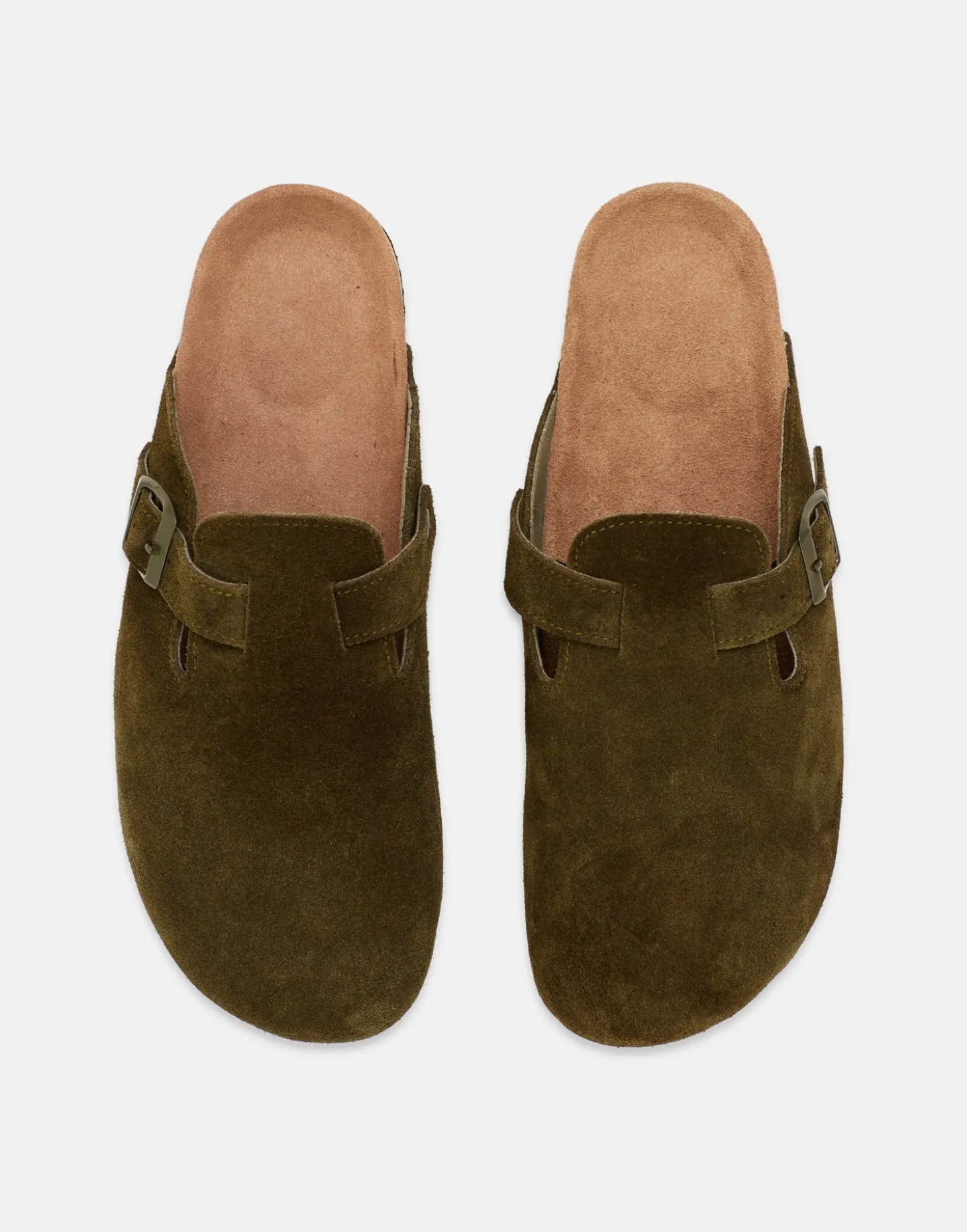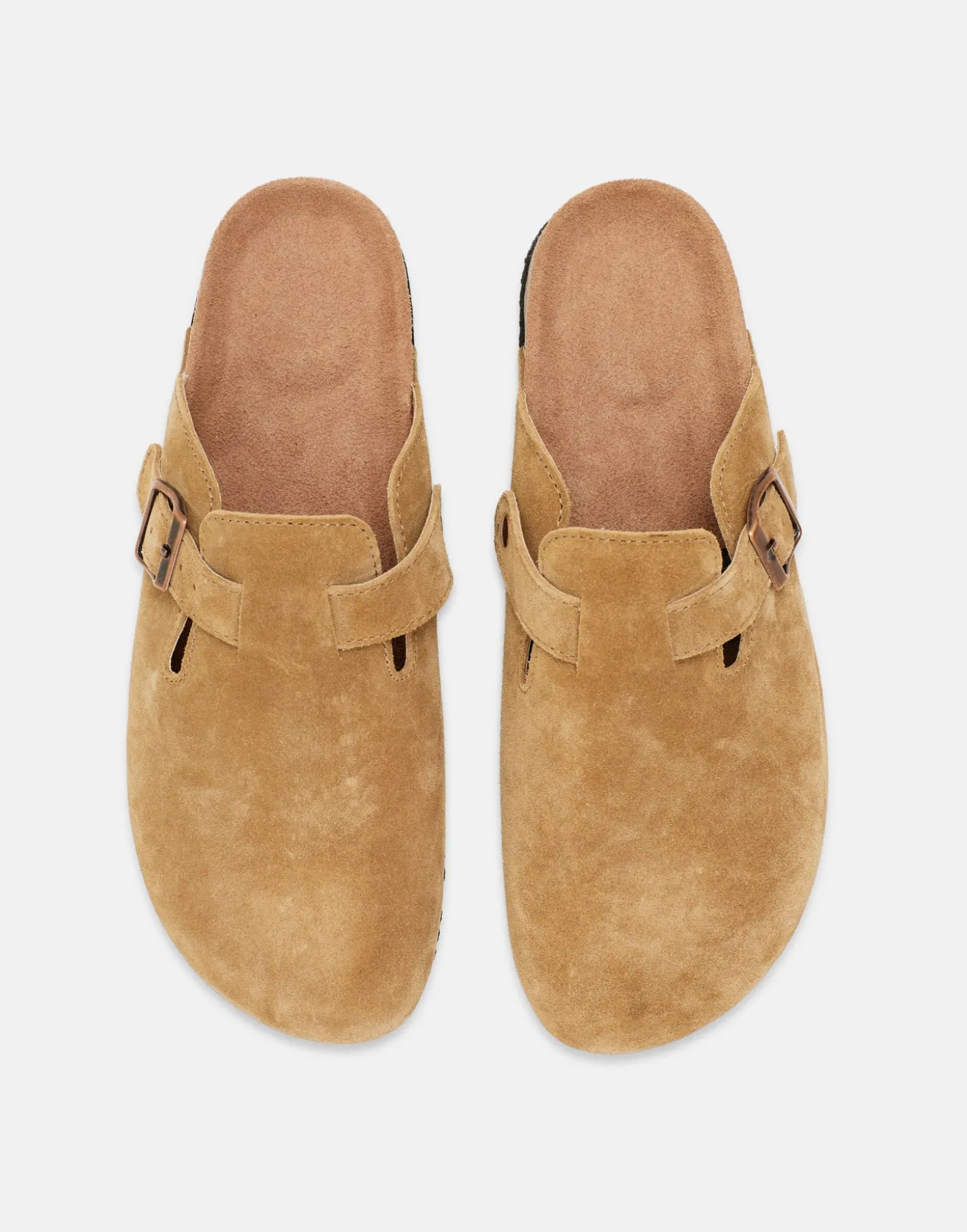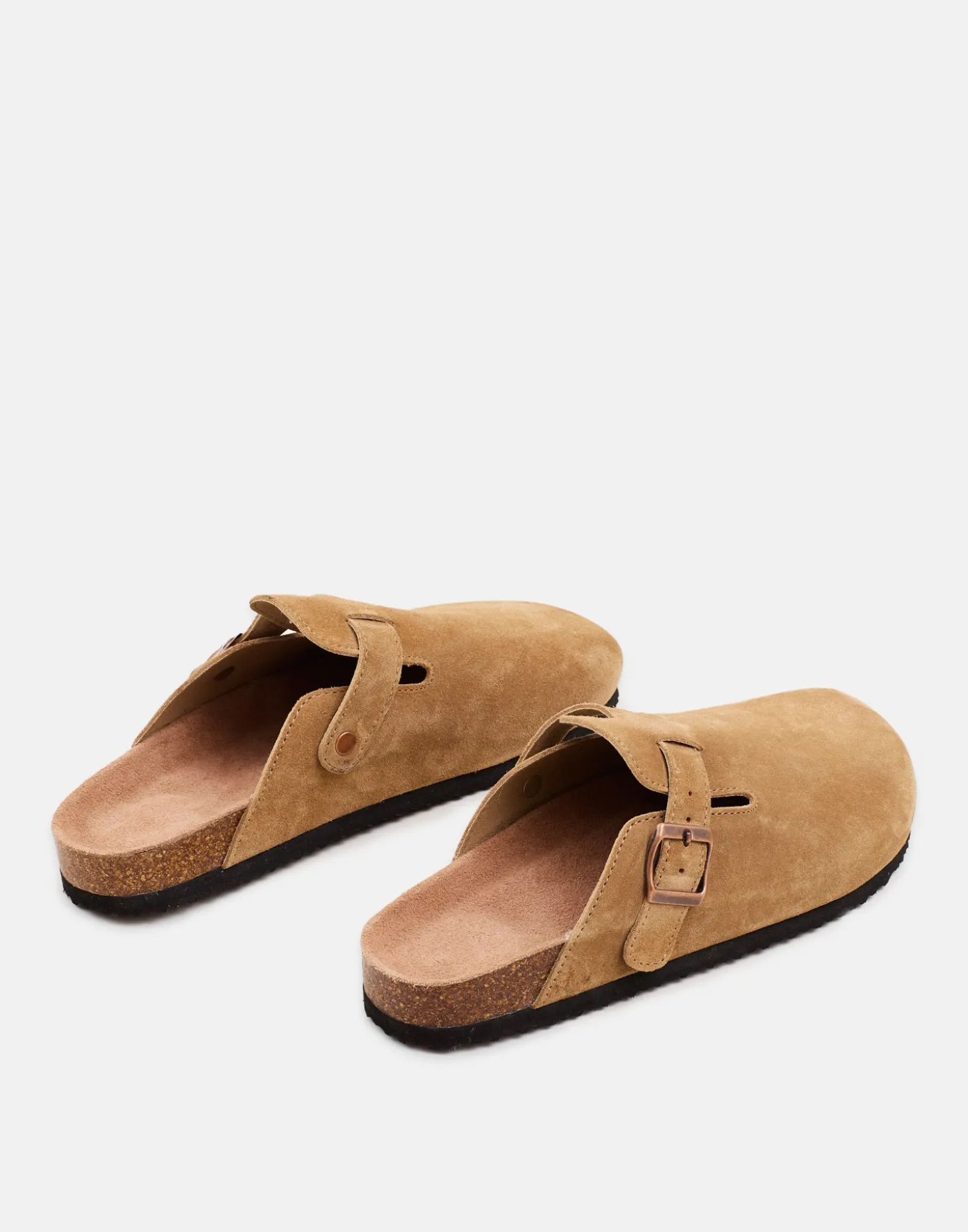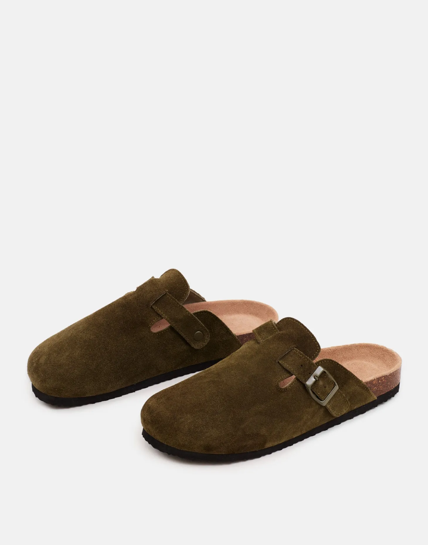 Zapato tipo zueco con diseño destalonado, corte de piel de serraje y suela de corcho. Detalle de hebilla en el corte.