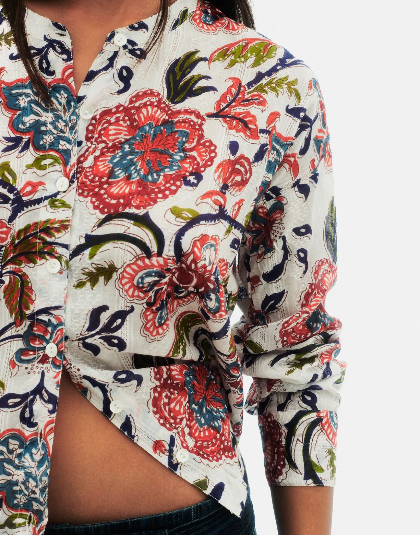 Blusa floral de manga larga y cuello redondo, con detalles de bordados y encaje. Cierre frontal de botones.