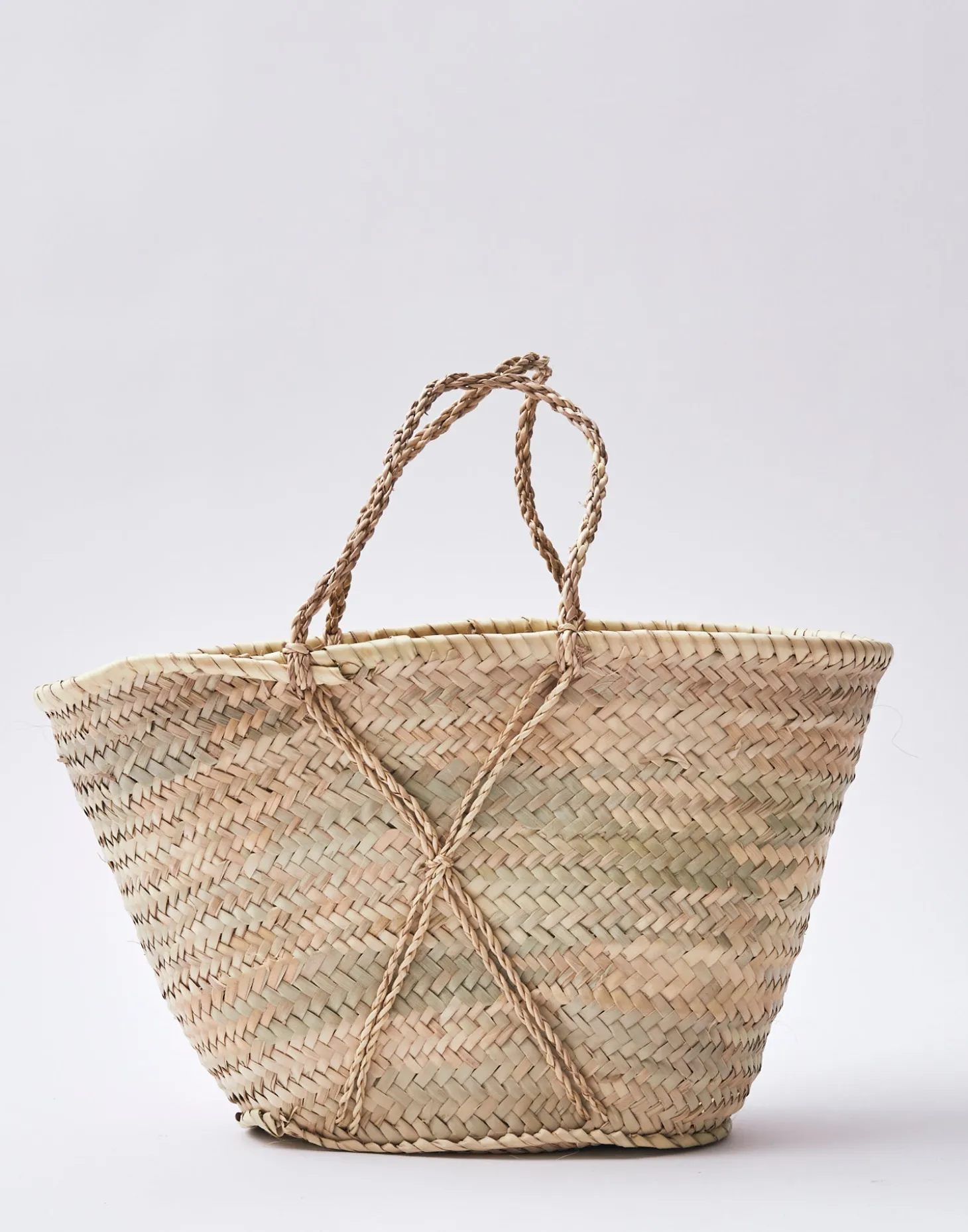 Capazo trenzado de paja con dos asas, sin cierre.