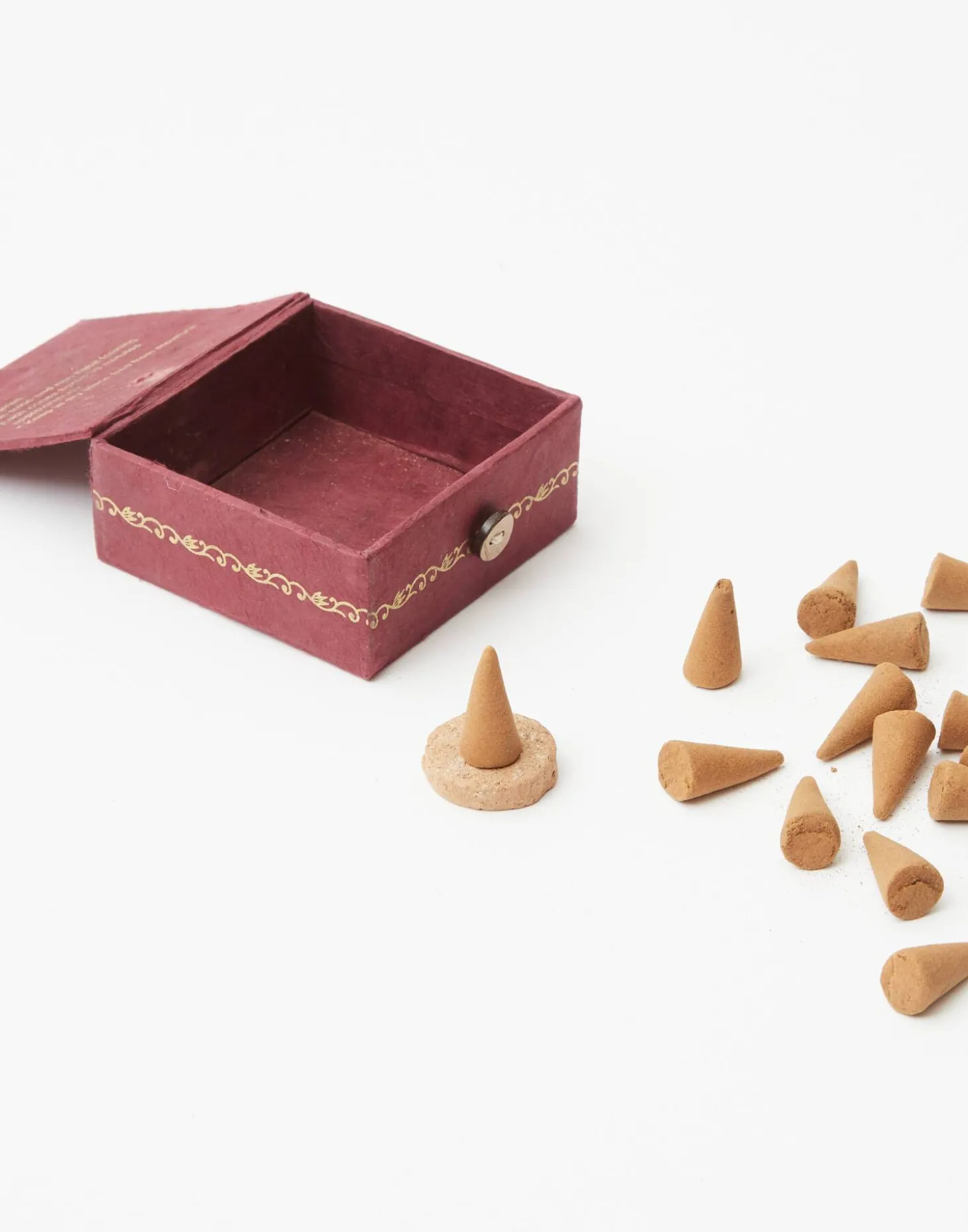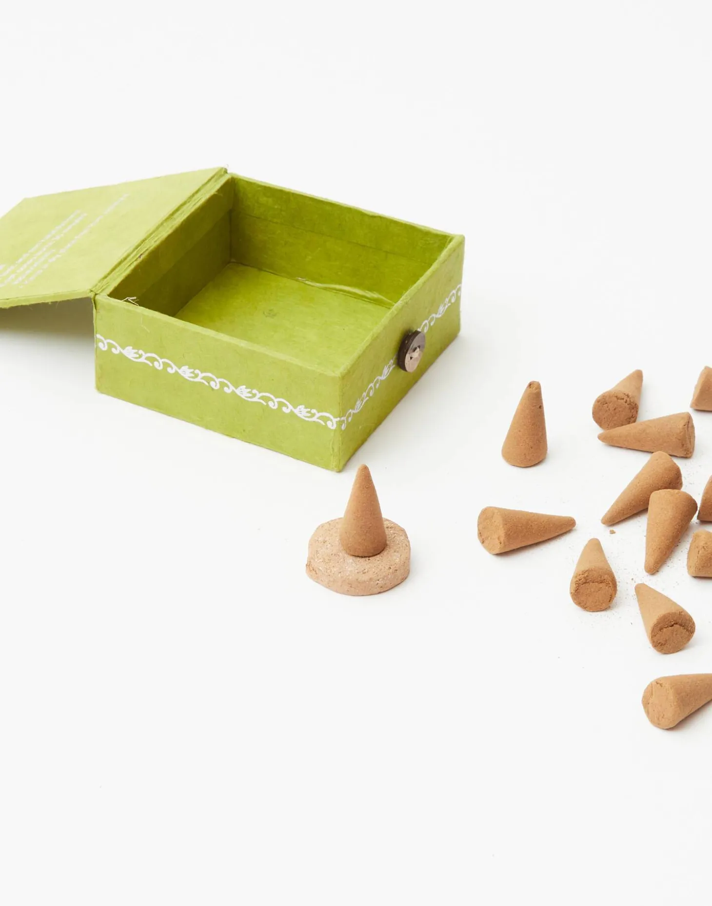 Incienso en formato cono hecho a mano en Nepal y quemador.