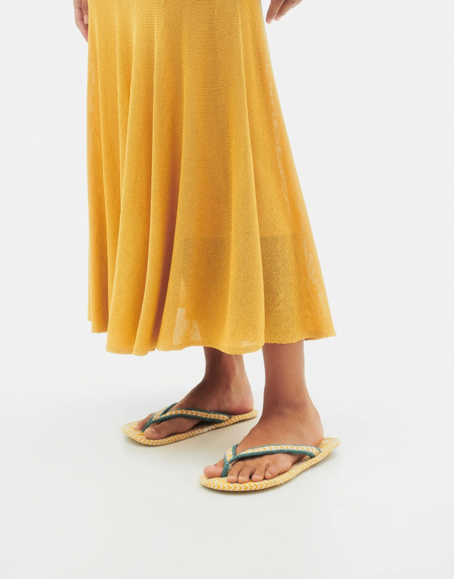 Falda midi de punto con cintura elástica y bajo acabado en volantes.