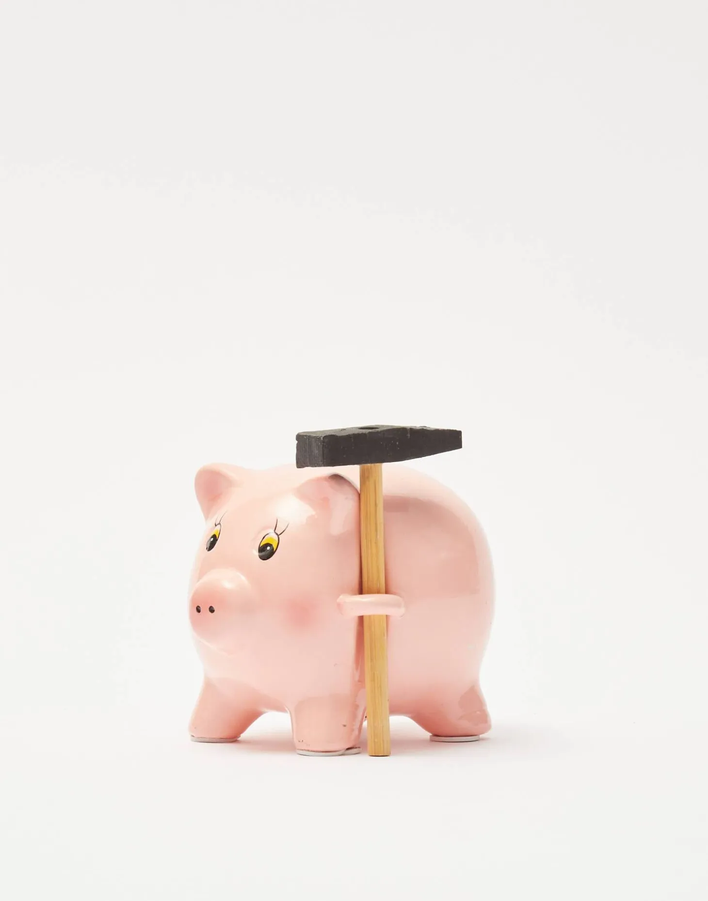 Hucha de cerámica con forma de cerdito. Para sacar el dinero tendrás que usar el martillo que viene incluido.