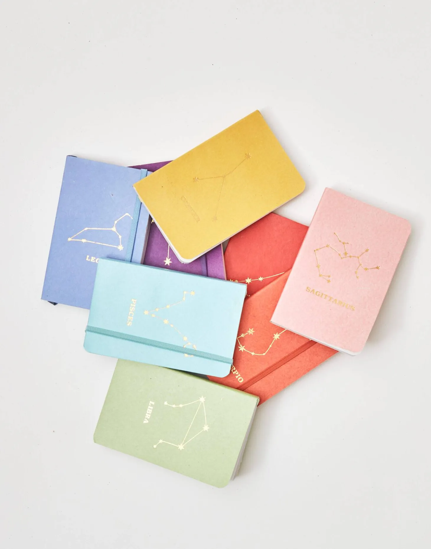 Cuaderno de tapa blanda con ilustración y texto correspondiente a cada signo del zodíaco. Cierre con elástico y cinta marcapáginas. Contiene 144 hojas lisas.