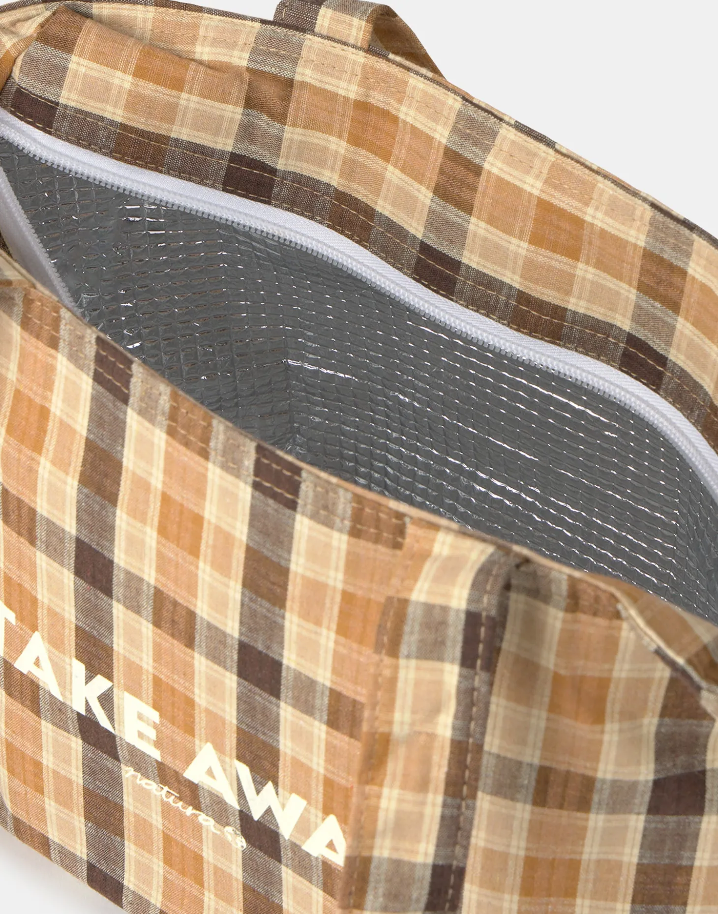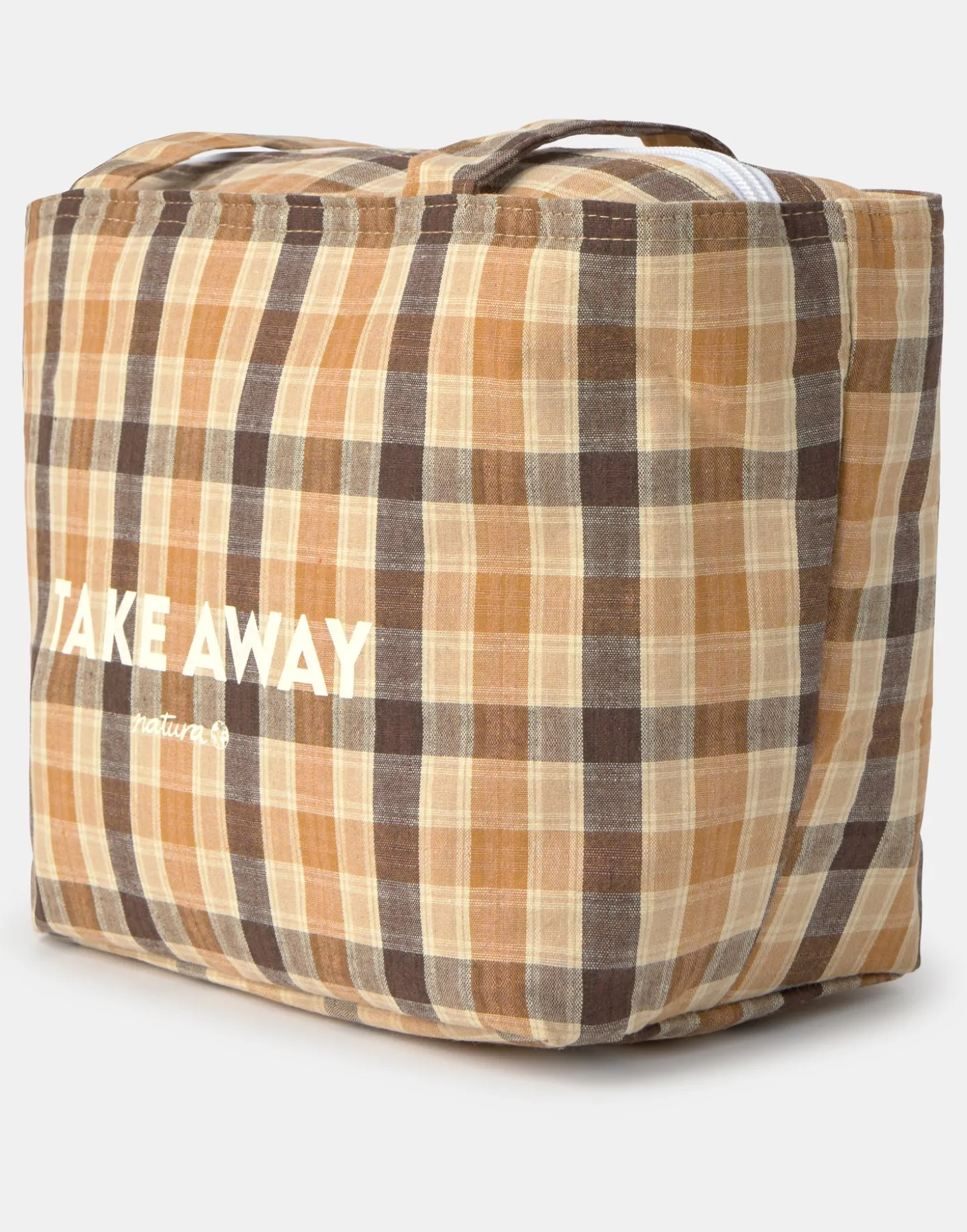 Bolsa para transportar comida, con cierre de cremallera en la parte superior y asas largas.