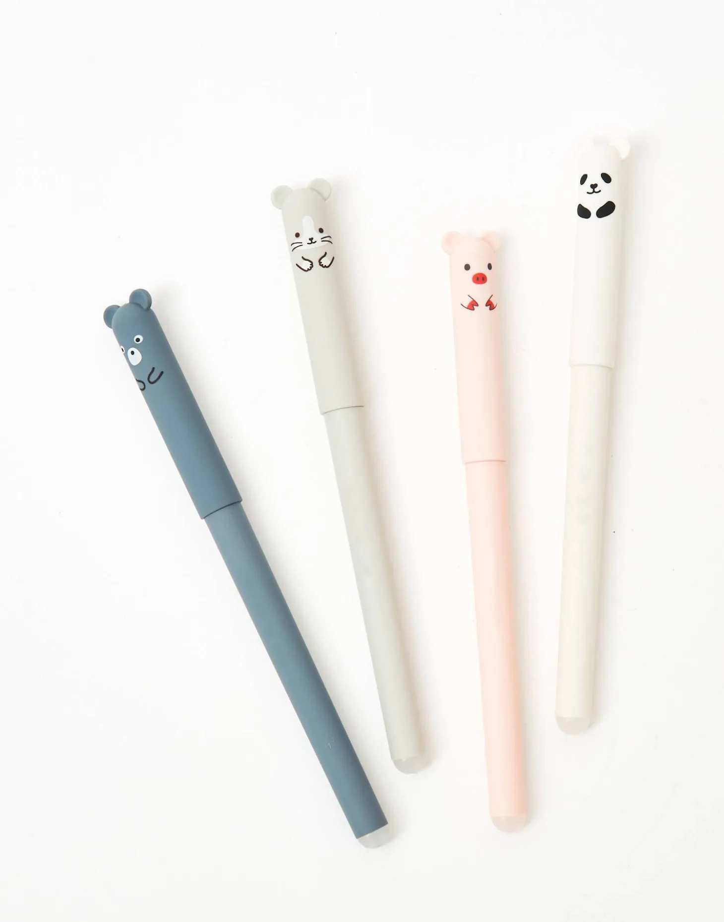 Pack de 4 bolis de tinta negra borrable, con tapa en forma de animalito y goma para borrar.