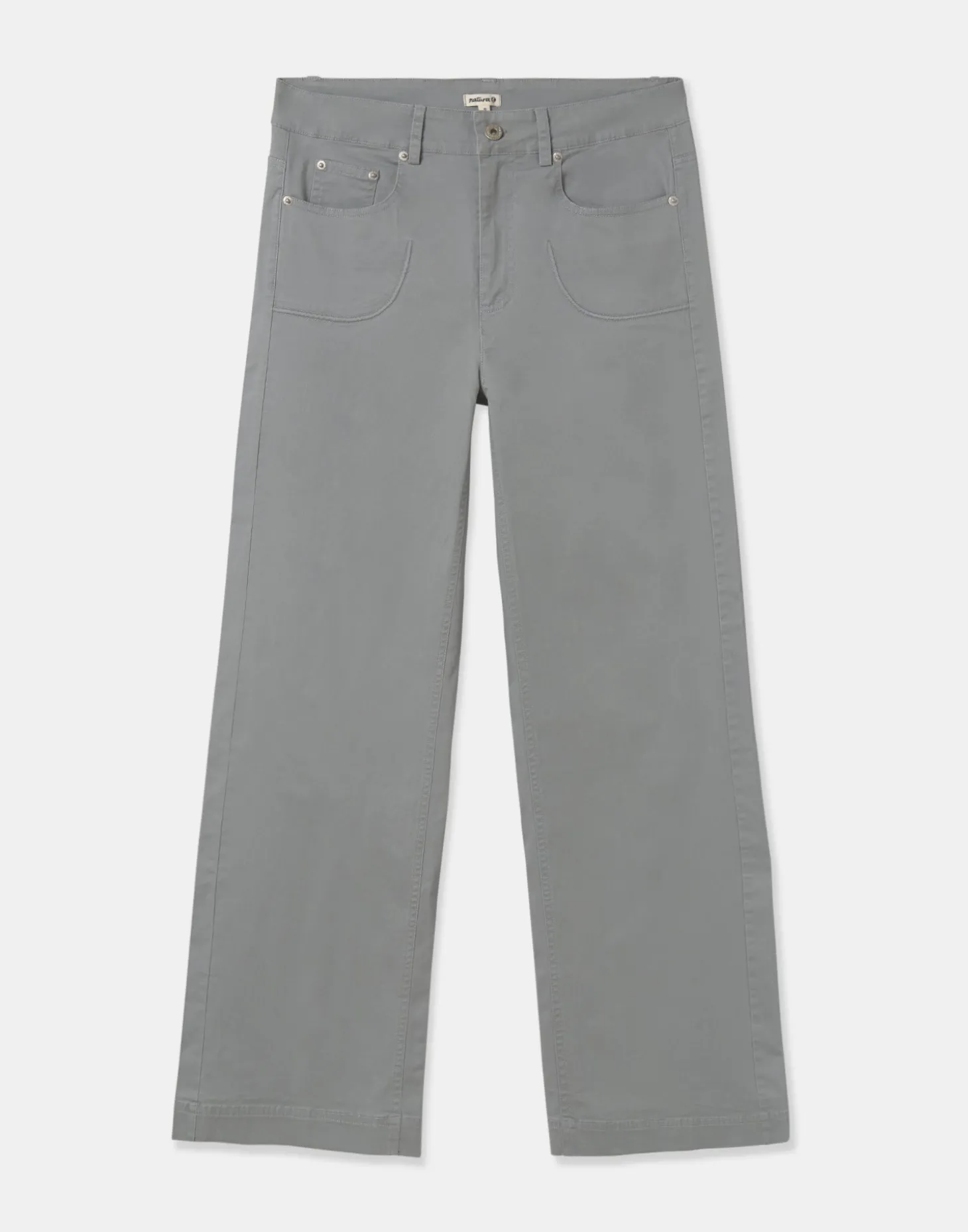 Pantalón recto, con cinco bolsillos y cintura con trabillas. Cierre frontal con cremallera y botón.