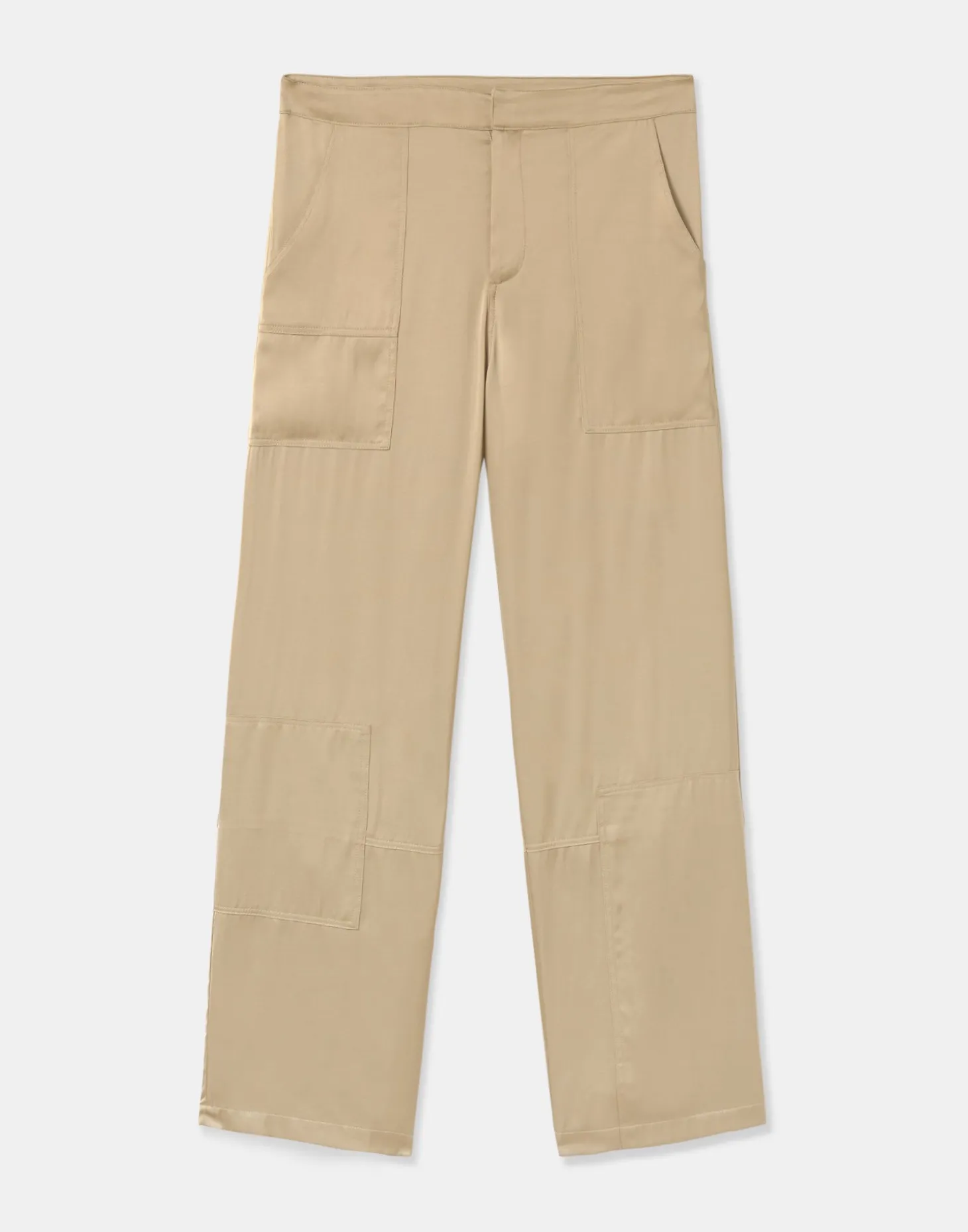 Pantalón con bolsillos delanteros y pernera recta. Detalle de tejido efecto brillo y cierre frontal con cremallera y gancho.