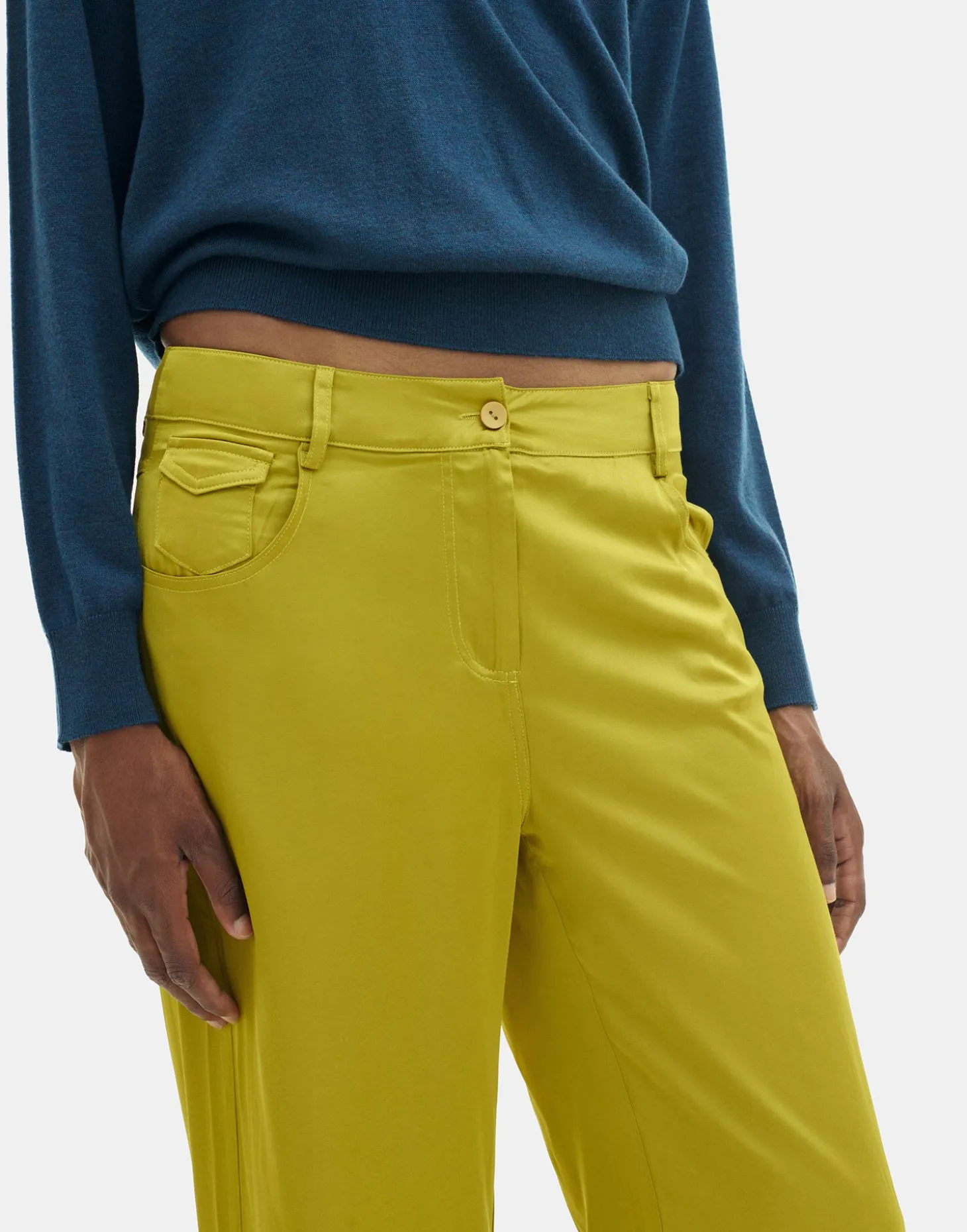 Pantalón recto confeccionado con tejido fluido de acabado satinado. Cinco bolsillos y cierre frontal de cremallera y botón.