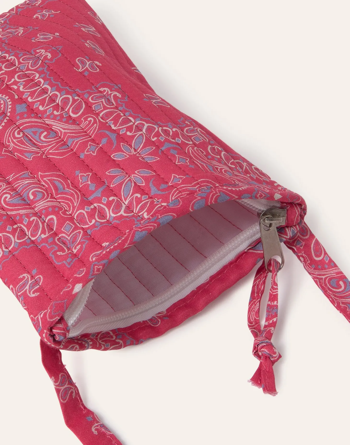 Bolsa portamóvil acolchado con estampado de bandana y cierre de cremallera. Acabado con cinta larga para poder llevarlo cruzado al hombro.