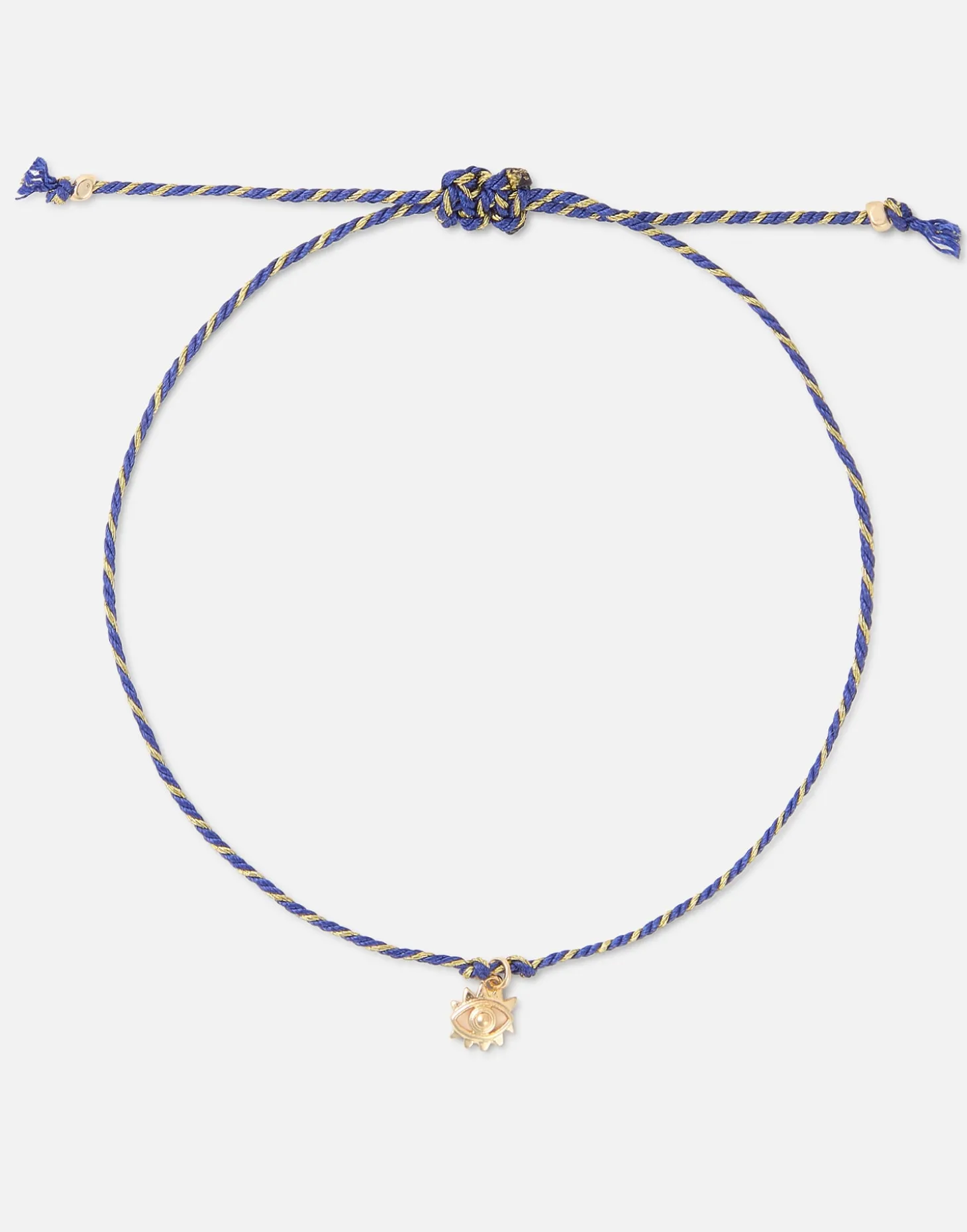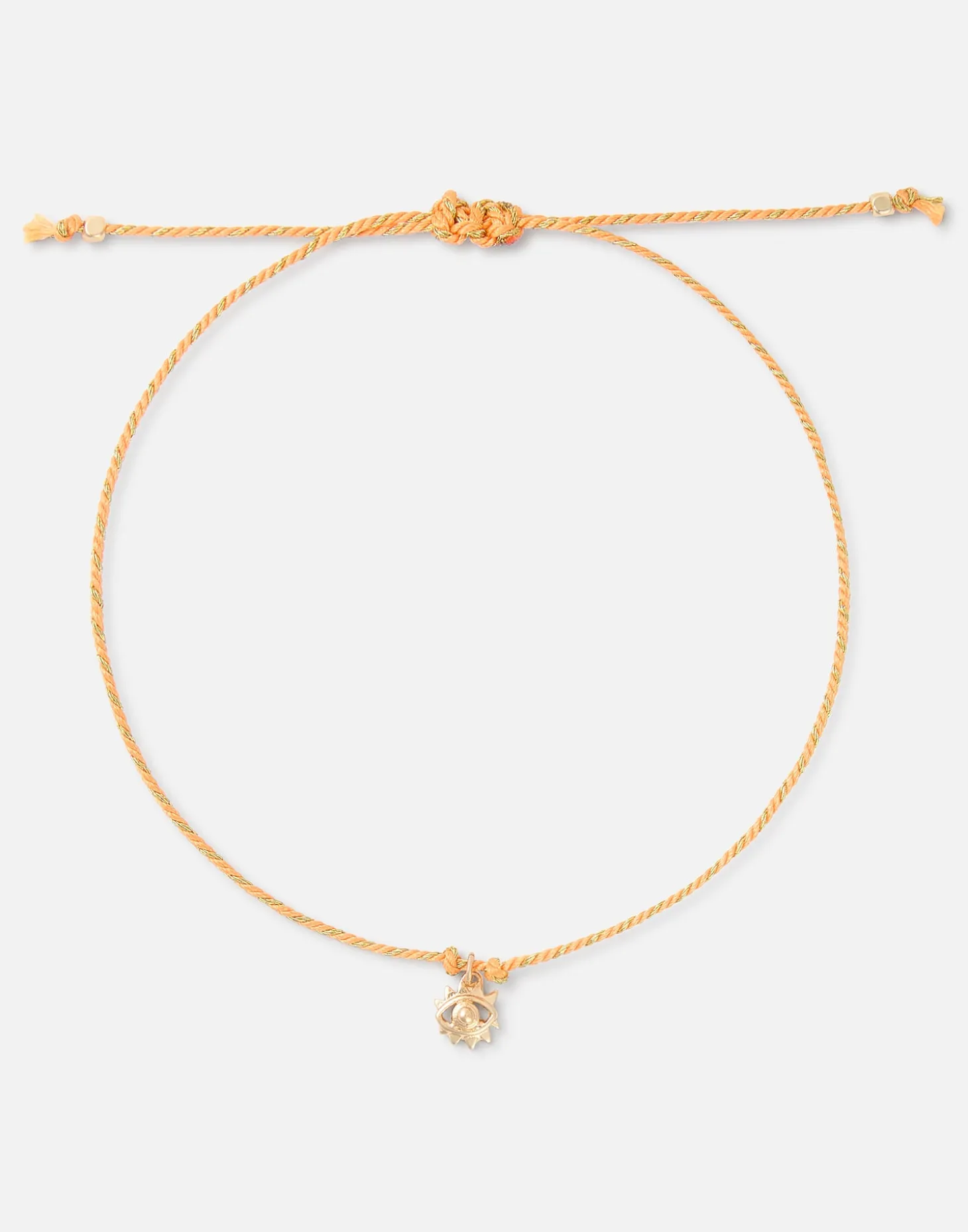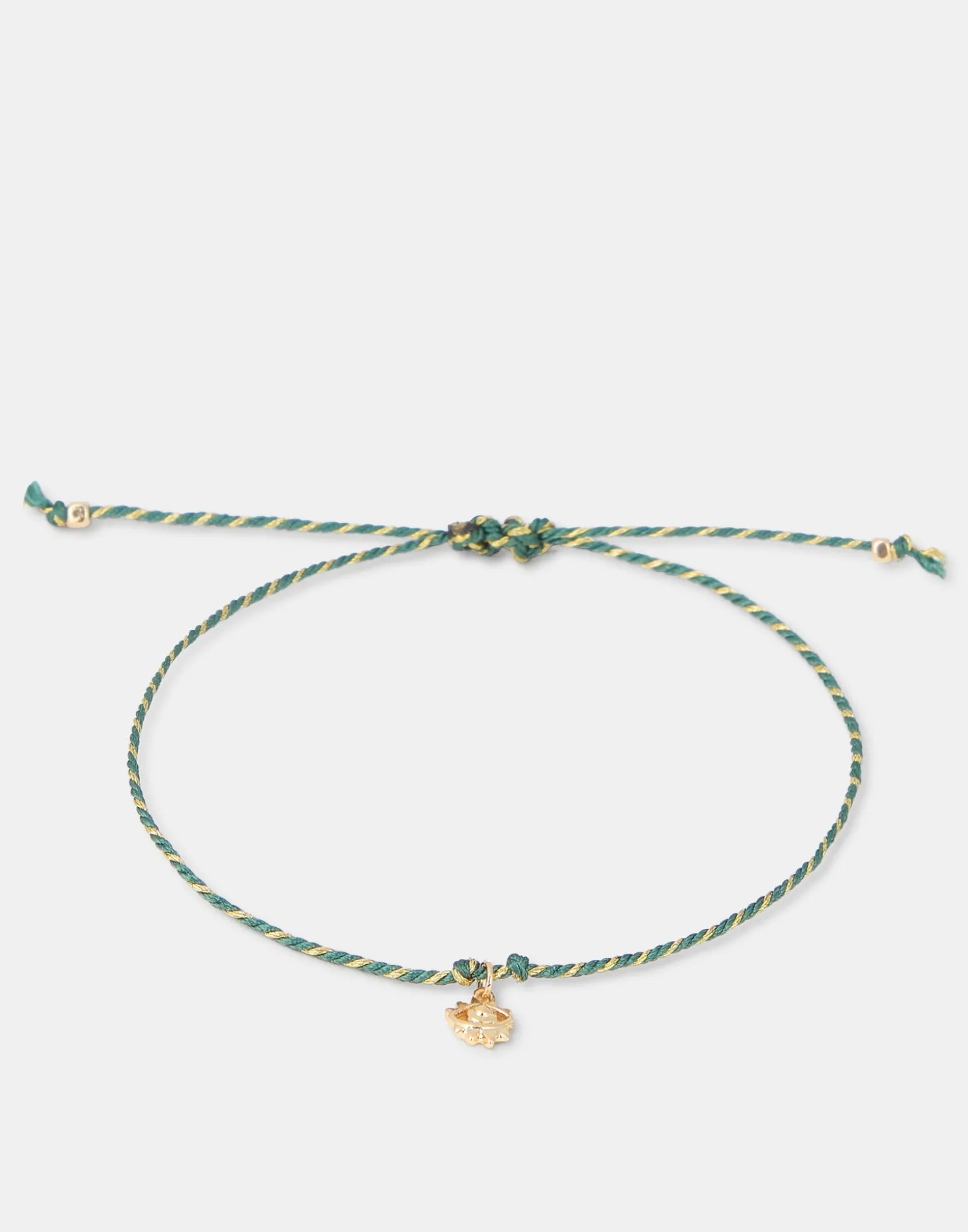 Pulsera de hilo con abalorio dorado y cierre de nudo corredizo.