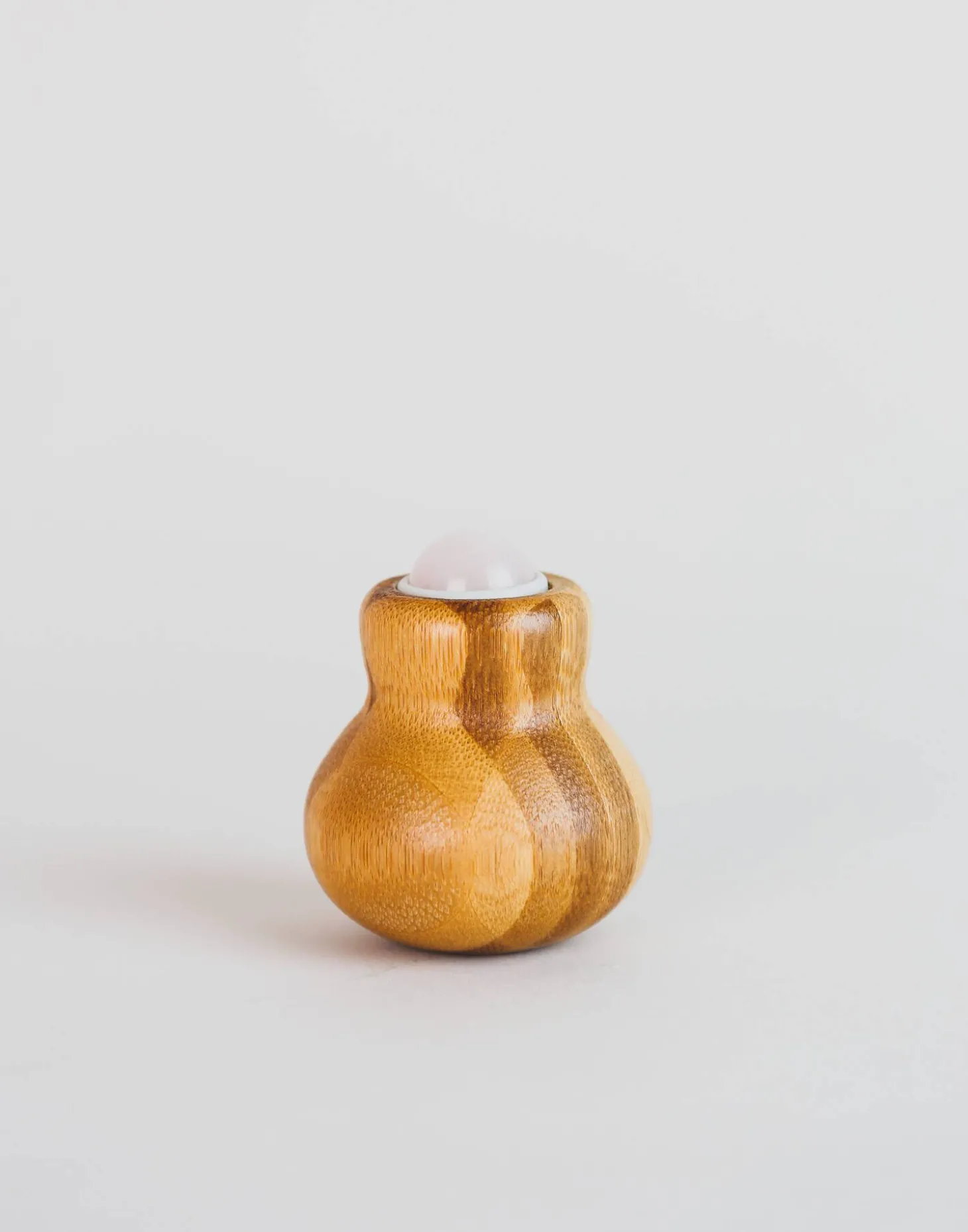 Masajeador roll-on de bambú con cuarzo rosa, para rostro y cuerpo. Aporta frescor inmediato, calma y relaja las zonas más sensibles de la piel activando la circulación.