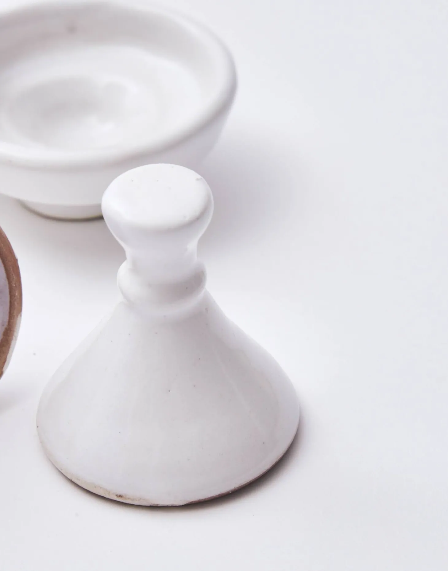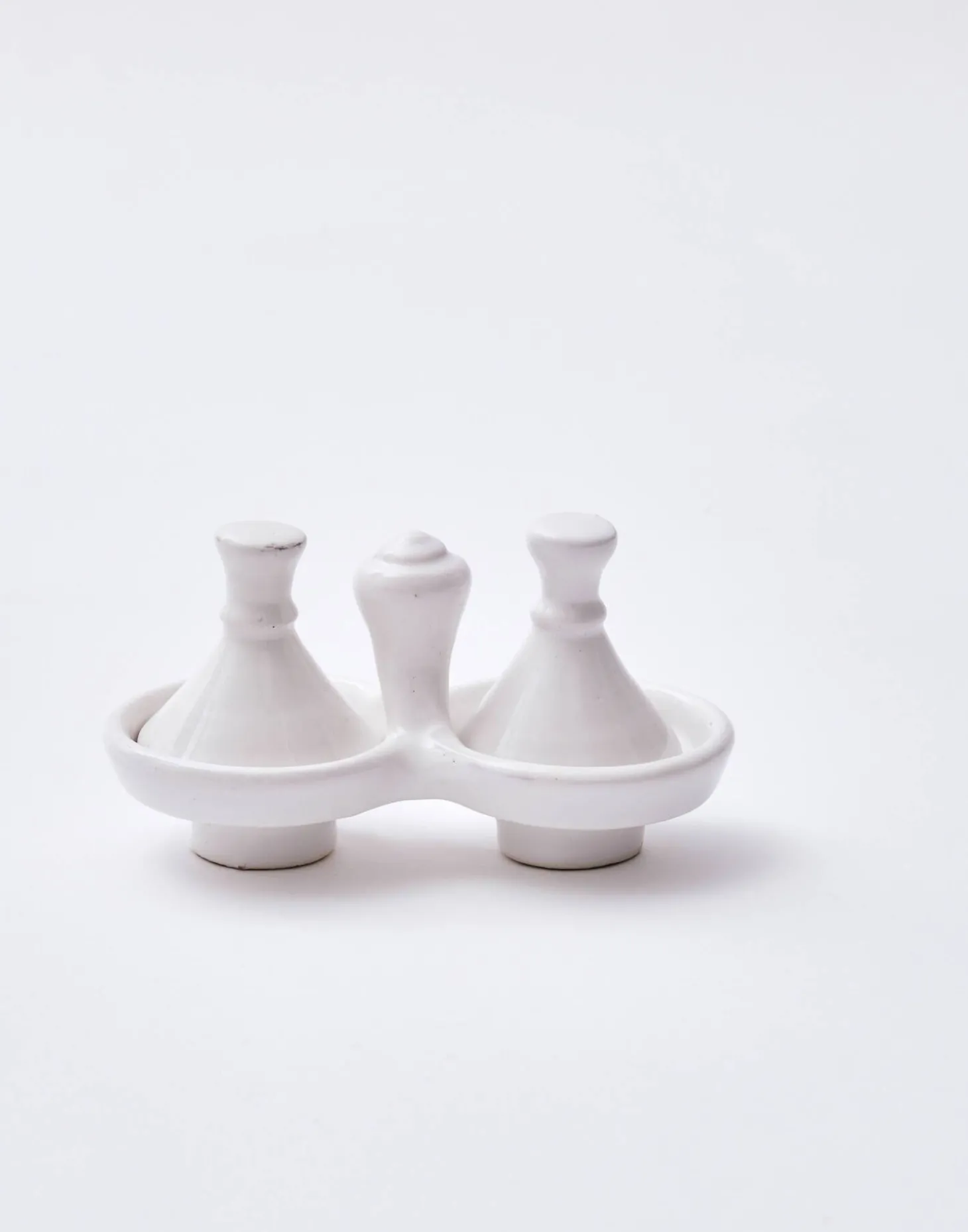 Especiero doble de cerámica hecho a mano en Marruecos. Ten siempre a mano la sal y la pimienta, tanto en la cocina como en la mesa, con este accesorio práctico y decorativo inspirado en los tajines tradicionales.