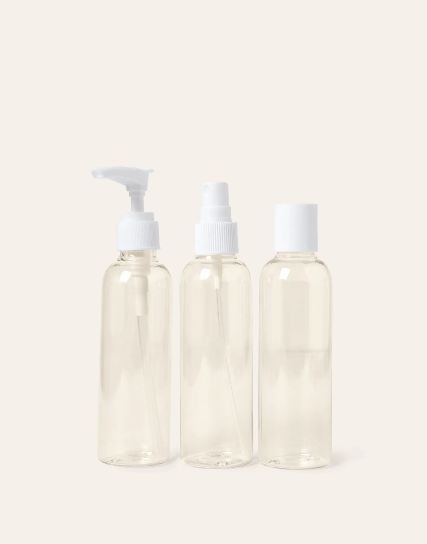 Neceser de viaje con 3 botellitas y 3 botecitos, el kit indispensable en cualquier maleta. Son rellenables, y en ellas podemos transportar muy cómodamente productos de baño, higiene o cosmética. Su tamaño está especialmente pensado para que puedas llevar este accesorio de viaje como equipaje de cabina sin ningún problema.