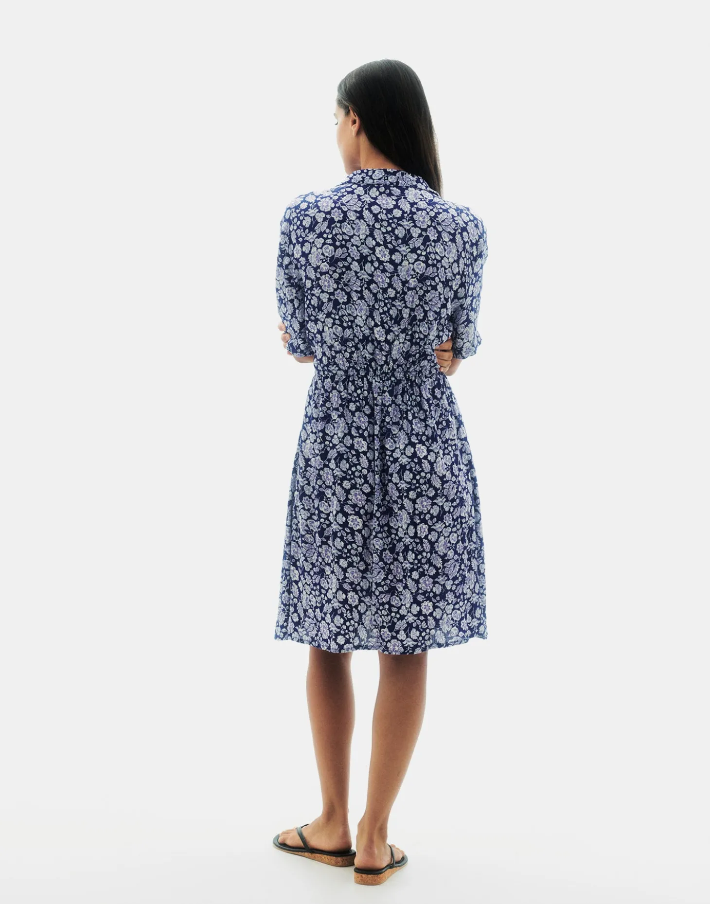 Vestido de manga corta con estampado floral, cuello solapa, cintura elástica y escote de pico con cierre parcial de botones.