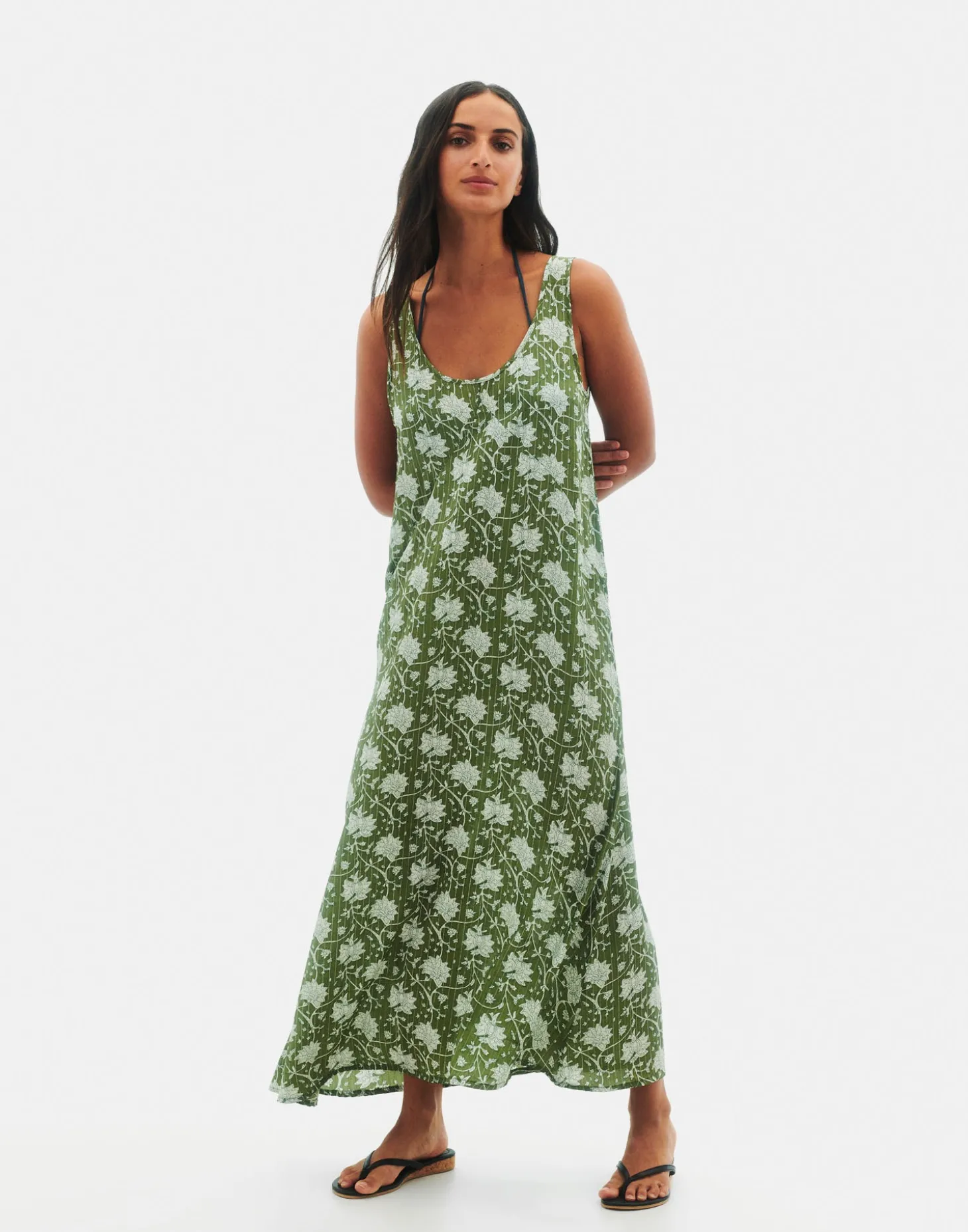 Vestido largo estampado sin mangas. Escote redondo. Tejido en mezcla de seda.